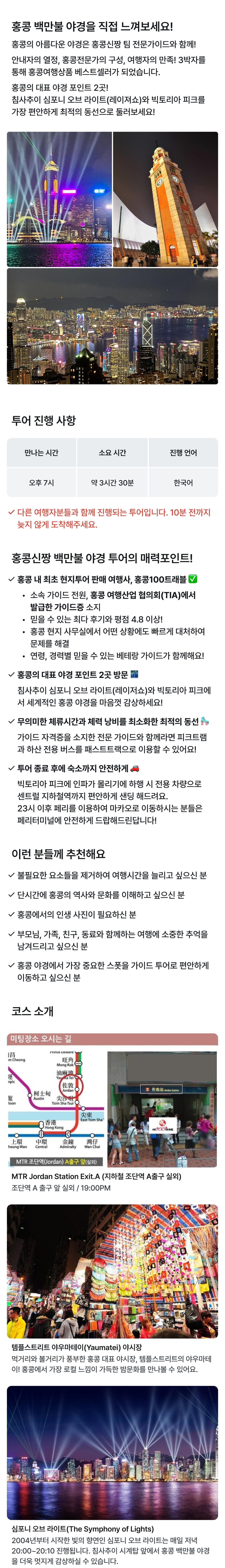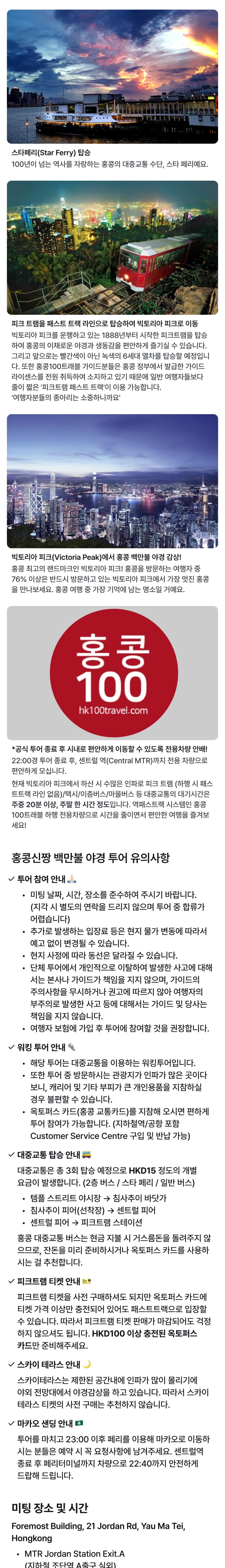 [홍콩 백만불 야경투어] 피크트램 패스트트랙, 심포니오브라이트 야경, 템플스트리트 야시장! 평점 4.8698630136986 · 리뷰 1460건 포함 홍콩100트래블 전문 가이드비 무선 수신기 대여비(4명 이상 시 사용) 무선 송수신기 유선 이어폰 빅토리아 피크~센트럴 지하철역까지 이동하는 하행 전용차량 피크트램 상행 시 패스트트랙-옥토퍼스 카드(홍콩 교통카드)로 입장 가능합니다! 불포함 대중교통비(약 HKD 19 정도/3회 이용) 피크트램 티켓(편도 HKD 82) 식사비 기타 개인경비 마이리얼트립에서 예약하기 홍콩 목록 도시 목록