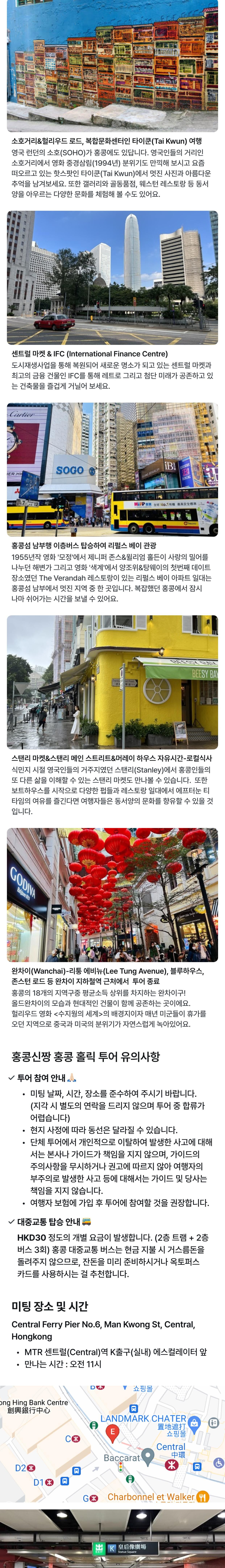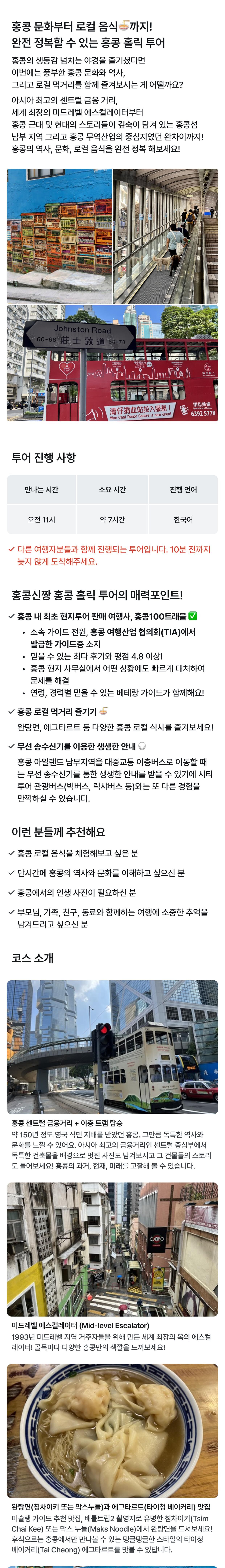 [홍콩 로컬문화 + 푸드 투어] 미드레벨 에스컬레이터, 소호거리, 타이쿤, 홍콩 남부까지! 평점 4.9473684210526 · 리뷰 114건 포함 홍콩100트래블 전문 가이드 비용 불포함 - 맛집 체험비(완탕면+에그타르트, 스탠리 로컬식당) - 대중교통 비용은 불포함이며 홍콩 교통카드인 옥토퍼스(Octopus) 카드를 지참해 오시면 좋습니다. - 대중교통 가격은 대략 홍콩달러 30$ 정도(한화 5,000원/이층 트램+이층버스 3회) 예상하시면 됩니다. - 기타 개인경비 마이리얼트립에서 예약하기 홍콩 목록 도시 목록