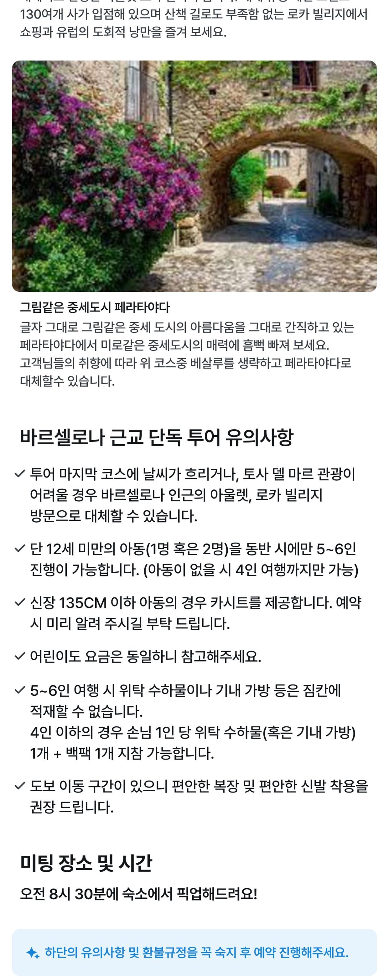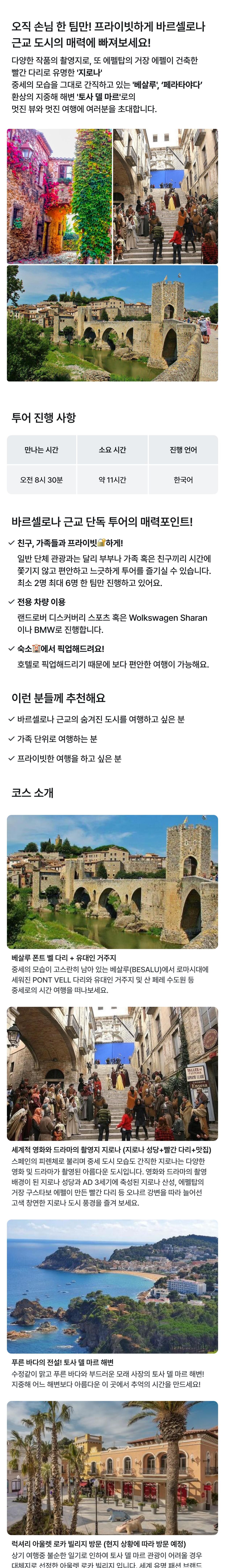 지로나+베살루(혹은 페라타야다)+토사델마르 단독투어 (바르셀 호텔 출발)<세곳을 하루에> 평점 4.9777777777778 · 리뷰 90건 포함 - 가이드비 및 가이드 식비 - 주차비, 통행료, 유류비 등 차량 제반 비용 불포함 - 고객님 중식 식사비 (자유식, 1인 25유로 내외) 밎 개인 비용 - 기타 입장을 원하시는 곳의 입장료(지로나 대성당 약 8유로/아랍 목욕탕 약 3유로) 마이리얼트립에서 예약하기 바르셀로나 목록 도시 목록