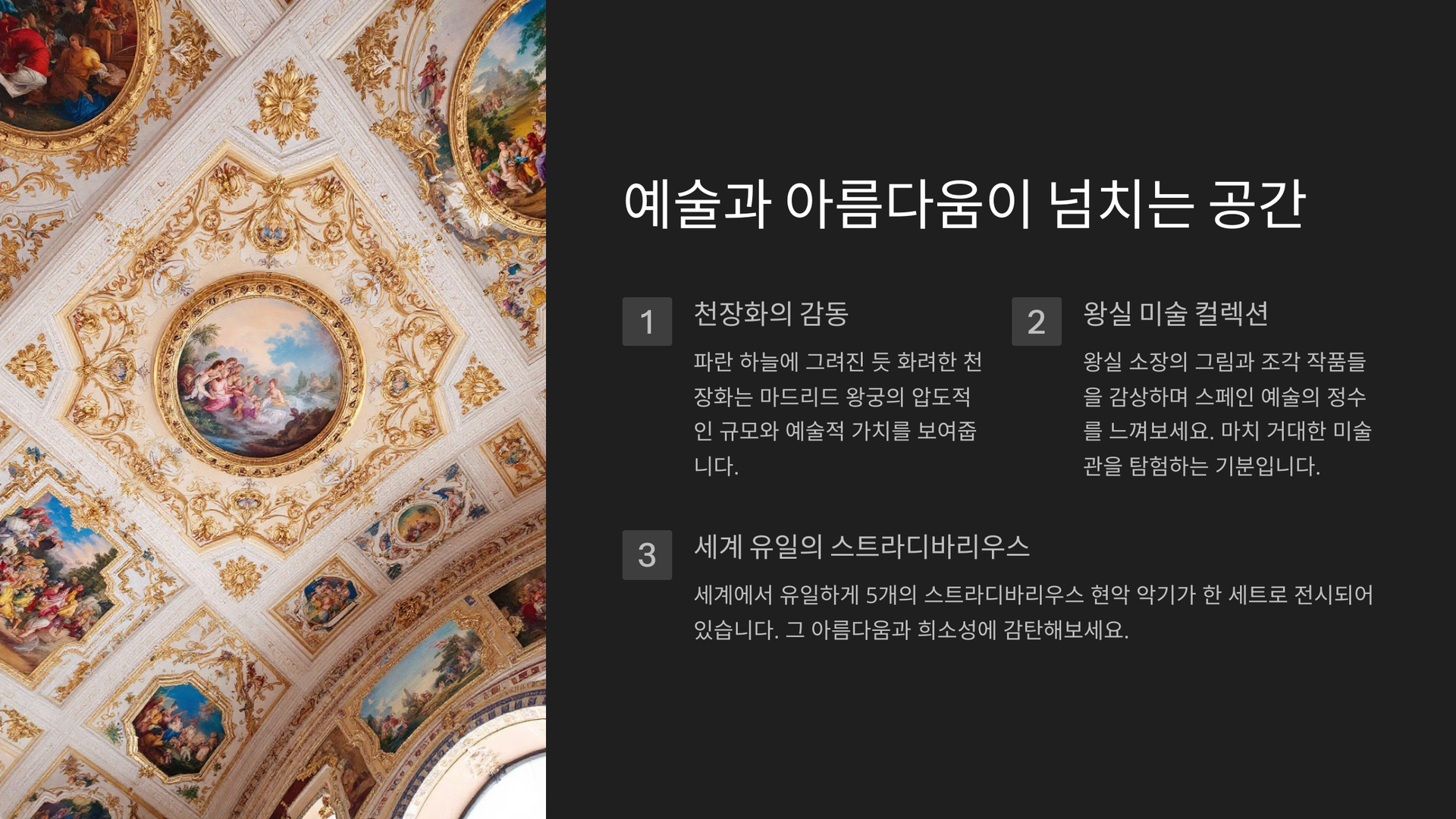 - 왕궁도 거대한 미술관이죠. 파란 하늘에 그려진 그림처럼 화려한 천장화와 왕실 미술 컬렉션에 감탄하기. 🎨🌌