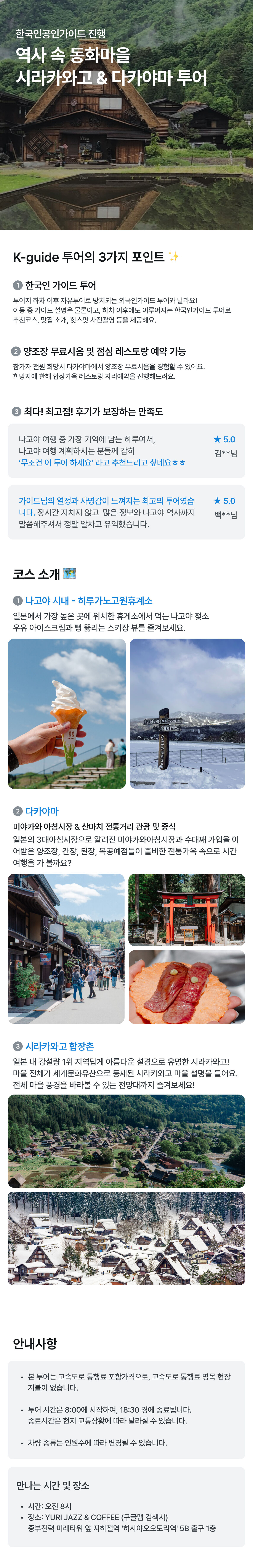 - 저희 투어는 타카야마에서는 왕복 추천 코스 중 편도는 가이드가 간단하게 안내해 드리고