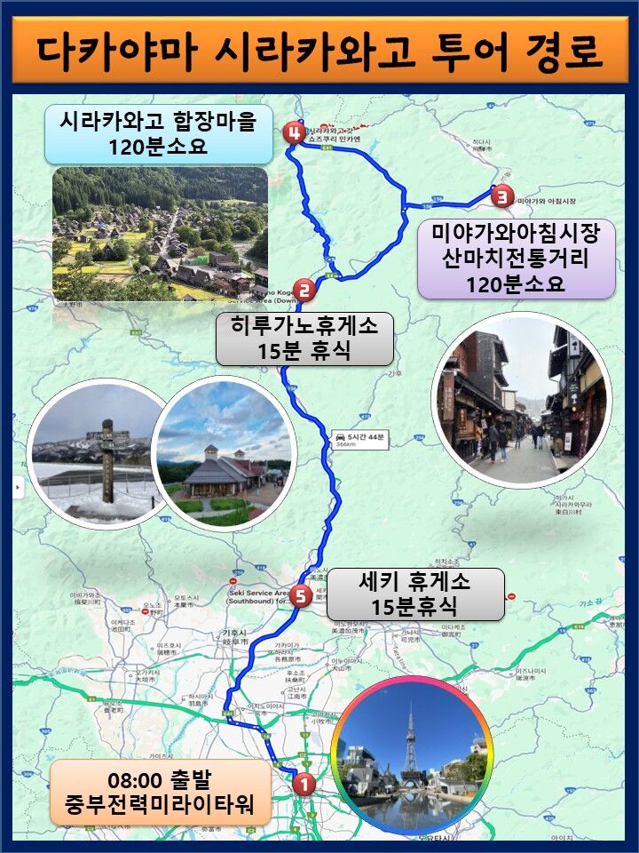 - 수요일 아닌 경우 시라카와고는 식당이 많지 않기 때문에 다카야마에서 점심을 들실것을 권유 드립니다.