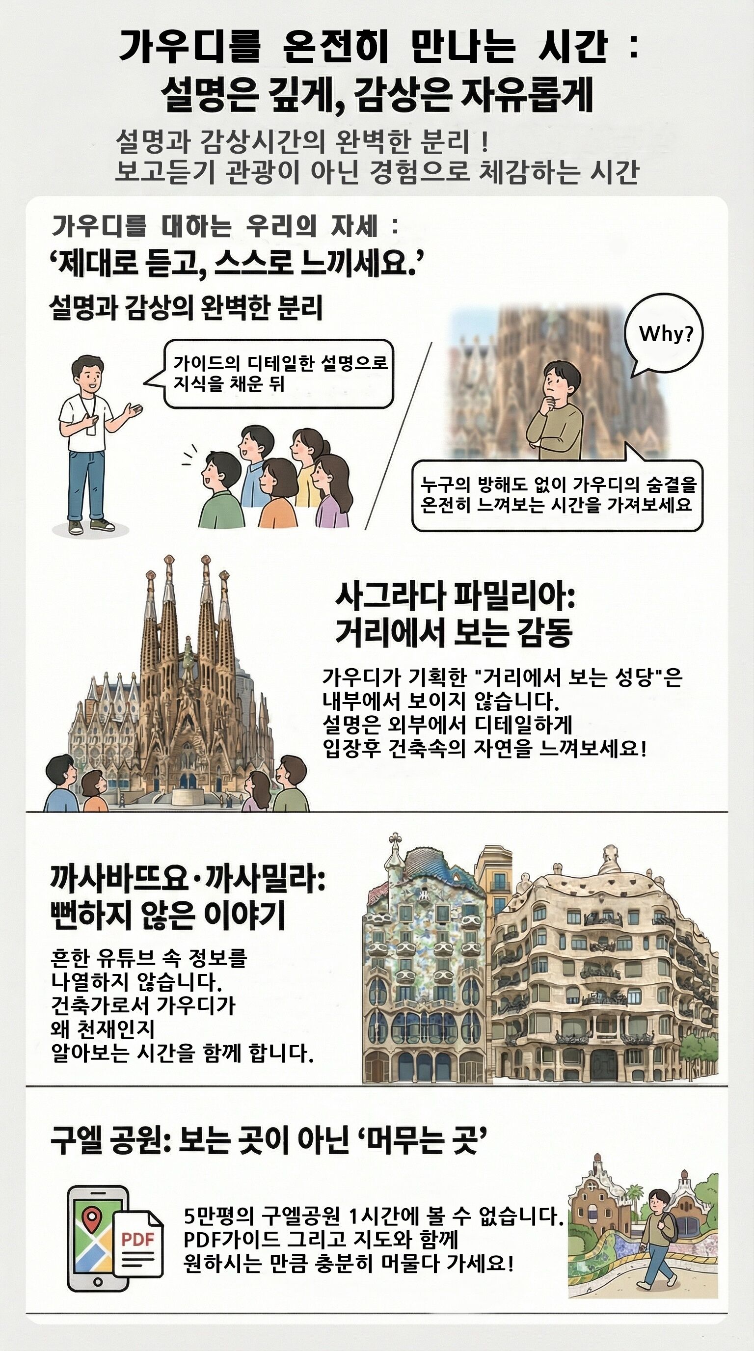건축 거장의 작품 앞에서 짧은 감상 시간 때문에 아쉬우셨나요? 깊이와 재미가 있는 설명 후, 관람은 가우디를 온전히 느낄 수 있는 시간으로 채워보세요!