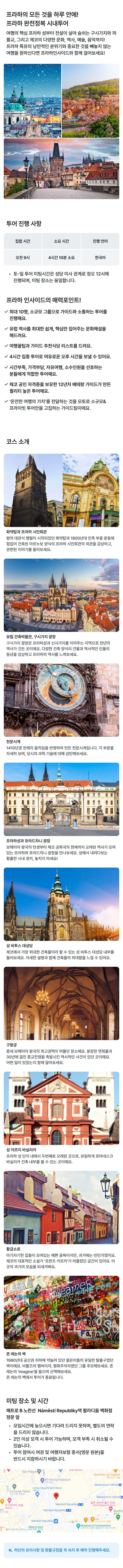 [소규모10인]프라하 완전정복 투어(+전문역사해설&여행꿀팁&추천식당) 평점 4.9903225806452 · 리뷰 620건 포함 - 한국인 공인가이드 비용 - 수신기 사용 비용 불포함 - 교통권 1회권 2매 (2 x 36코룬) 또는 24시간권 - 프라하 성 유료 입장비용 (성인 450 코룬/학생, 시니어 할인 있음/ 현금으로 소지 부탁드려요) - 개인 간식, 음료, 식사 등 기타 부대 비용 - 개인 이어폰 (3.5mm 개별적으로 소지부탁드려요, 없는 경우 대여 가능) - 개별여행자 보험 가입 마이리얼트립에서 예약하기 프라하 목록 도시 목록
