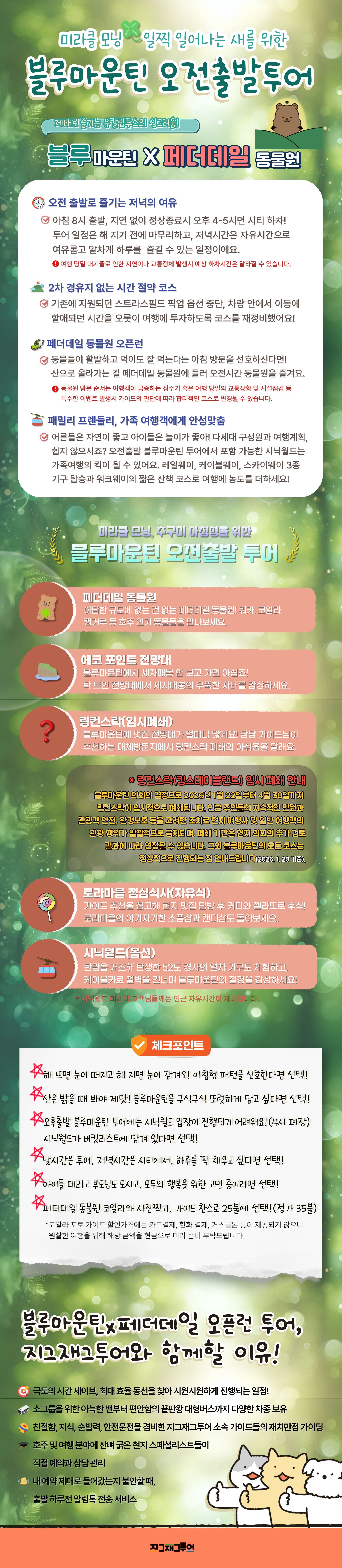 [단독혜택] 미라클모닝 블루마운틴 투어 ☼ 페더데일 동물원 오픈런+시닉월드 옵션