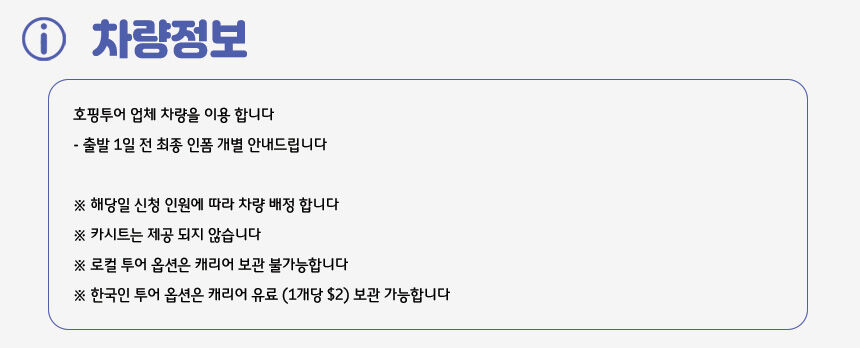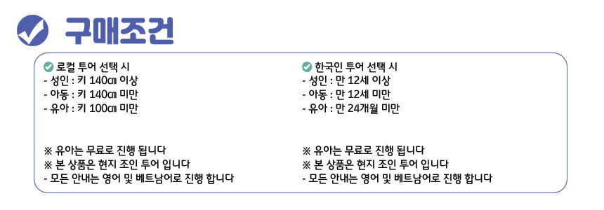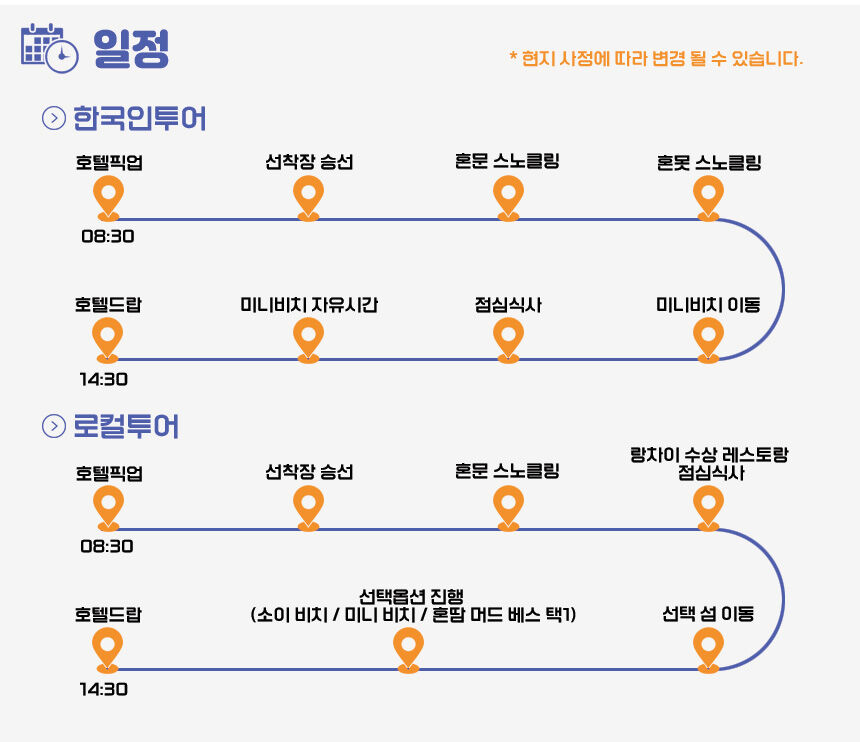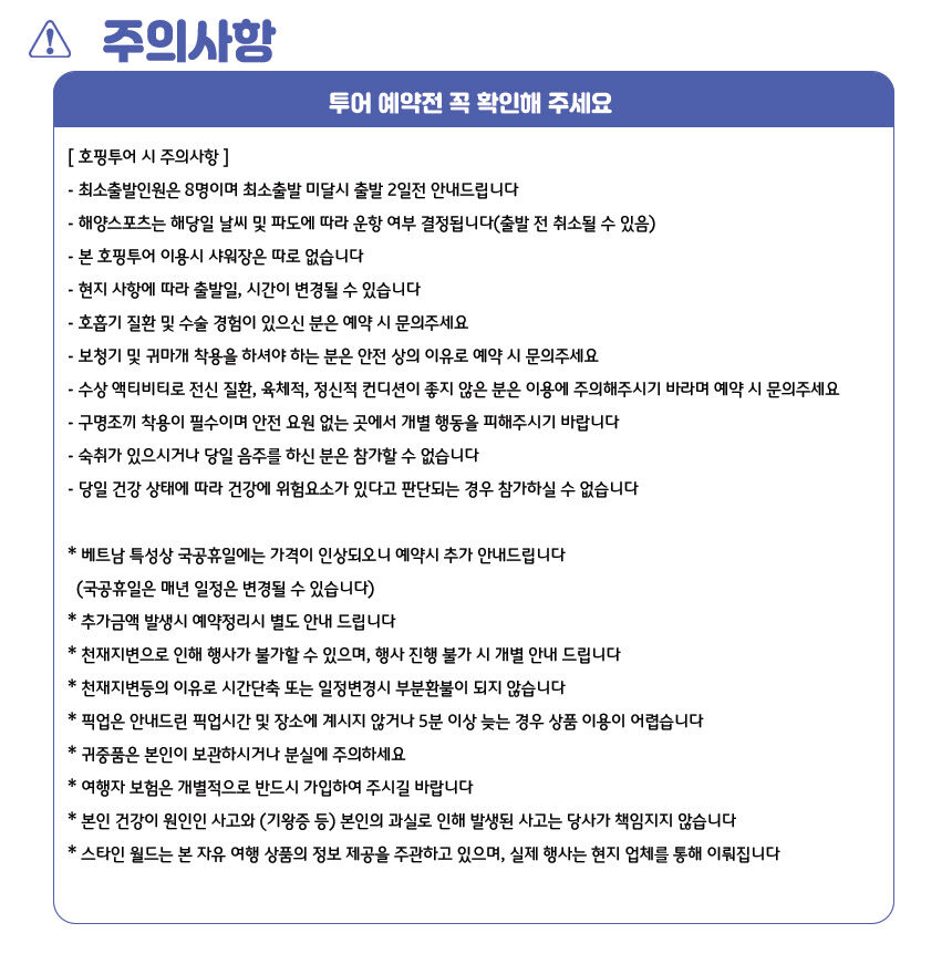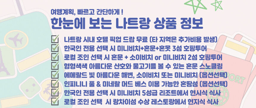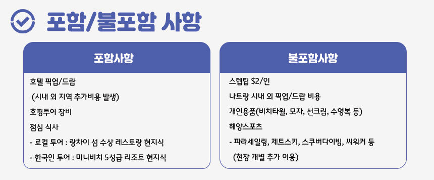 - +나트랑 시내 호텔 픽업/드랍 (시내 외 지역 추가비용 발생) +호핑투어 장비 +점심식사 - 로컬투어 : 랑차이 섬 수상 레스토랑 현지식 - 한국인투어 : 미니비치 5성급 리조트 현지식