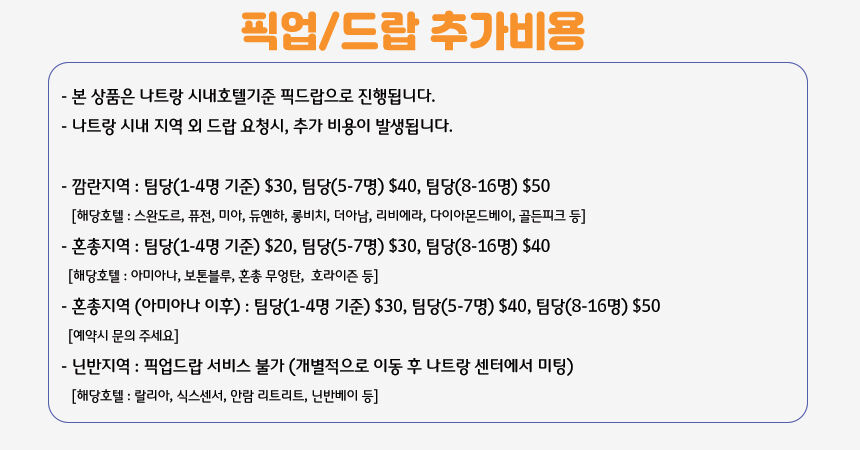 - - 스텝팁 $2/인 - 나트랑 시내 외 픽업/드랍 비용 - 개인용품 (비치타월, 모자, 선크림, 수영복) - 해양스포츠 (파라세일링, 제트스키, 스쿠버다이빙, 씨워커 등 현장 개별 추가 이용)