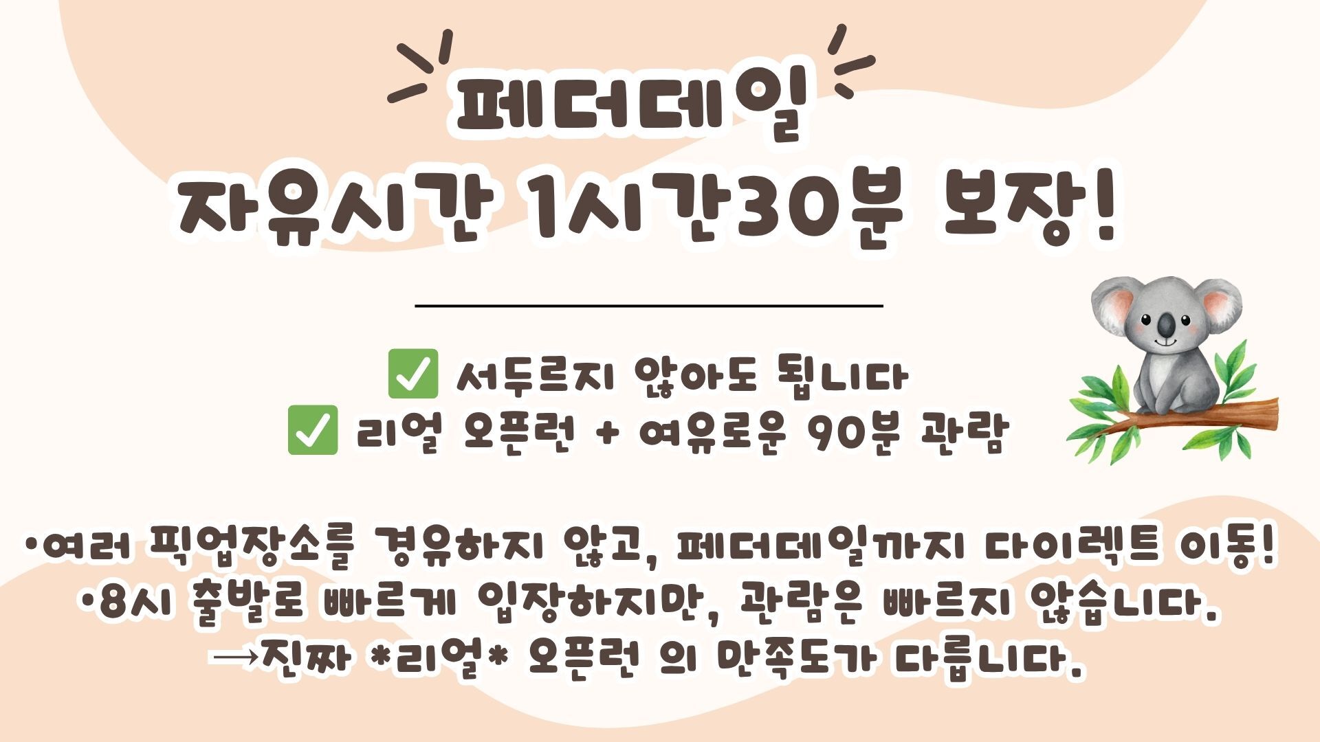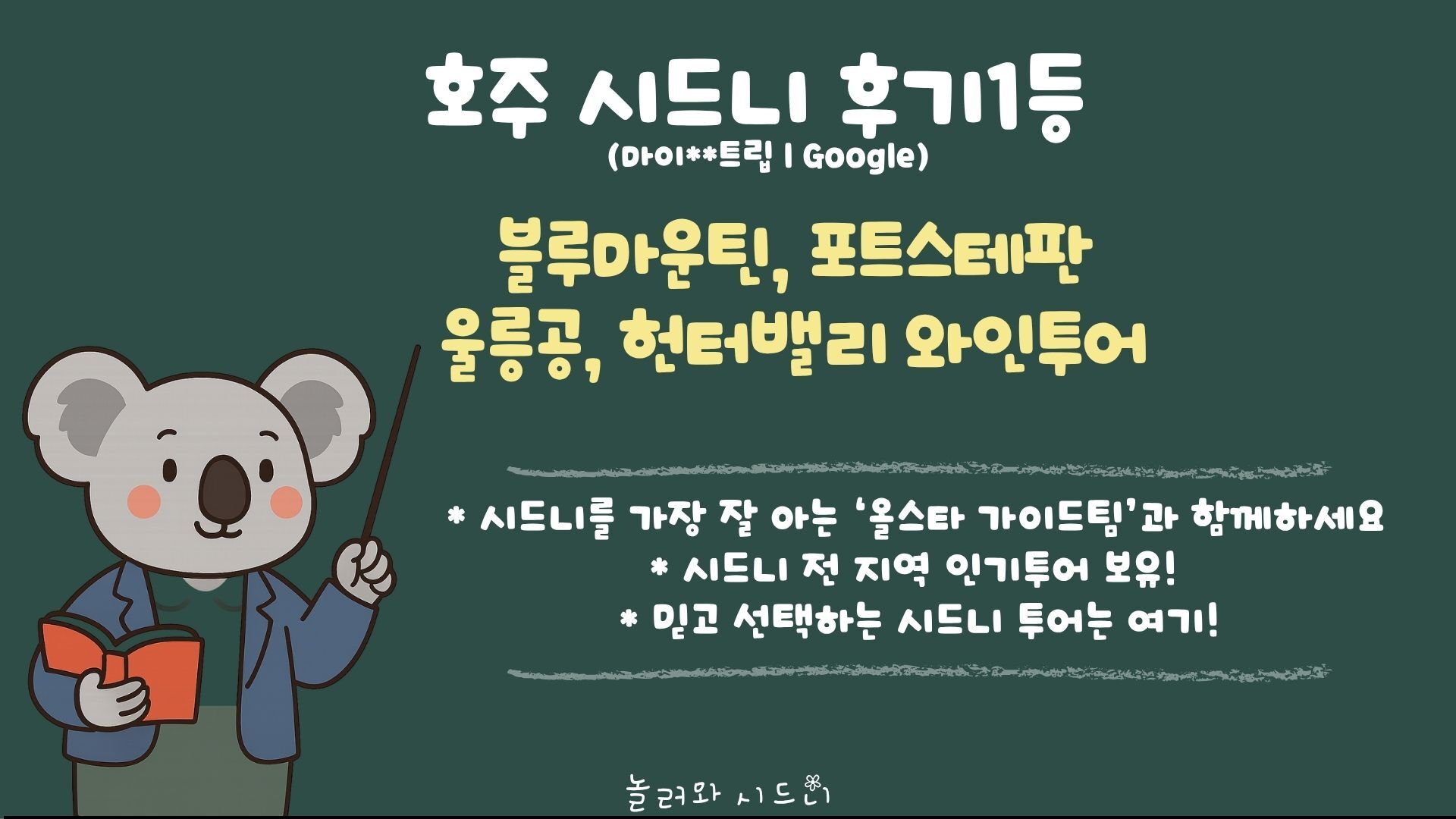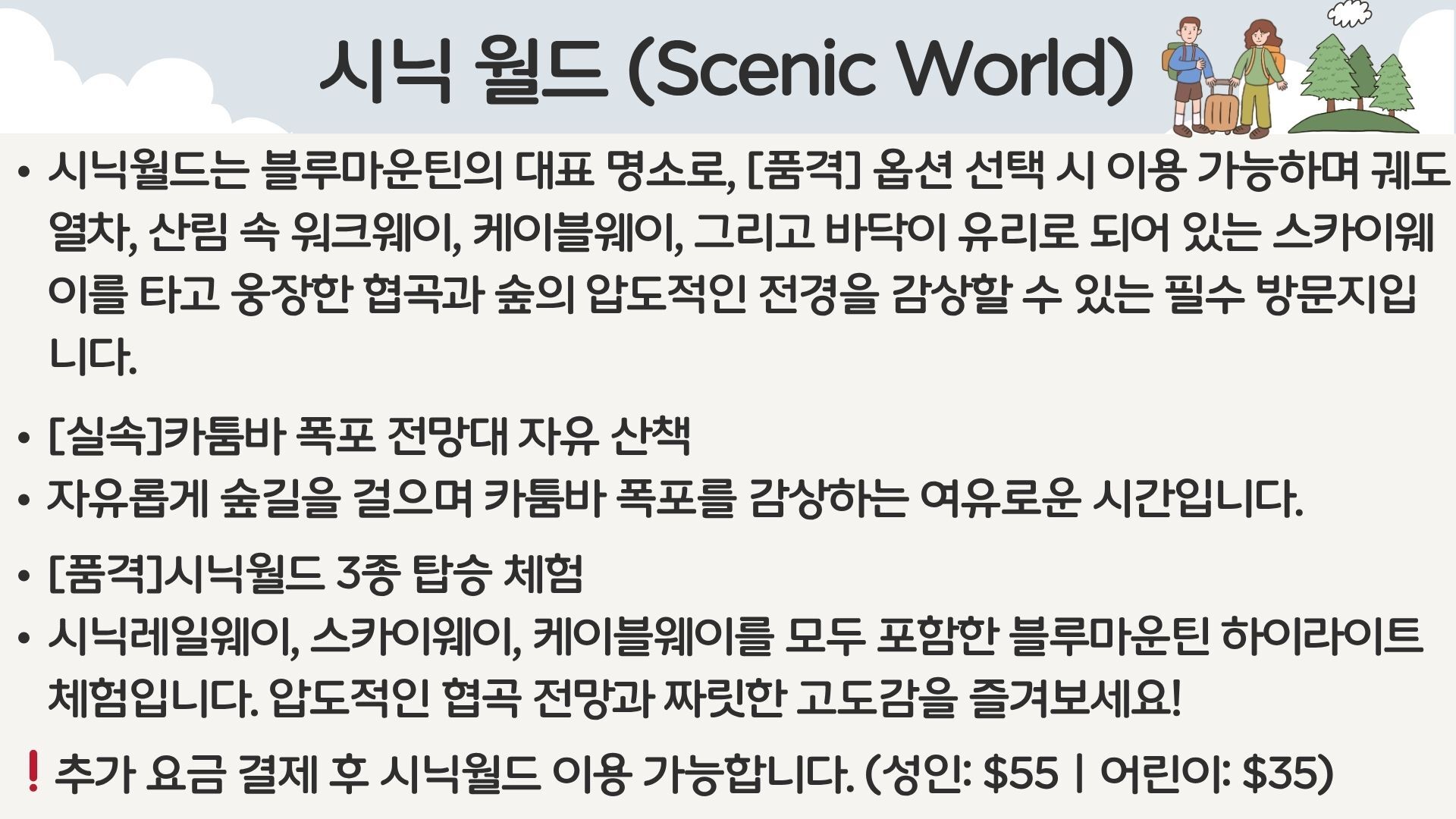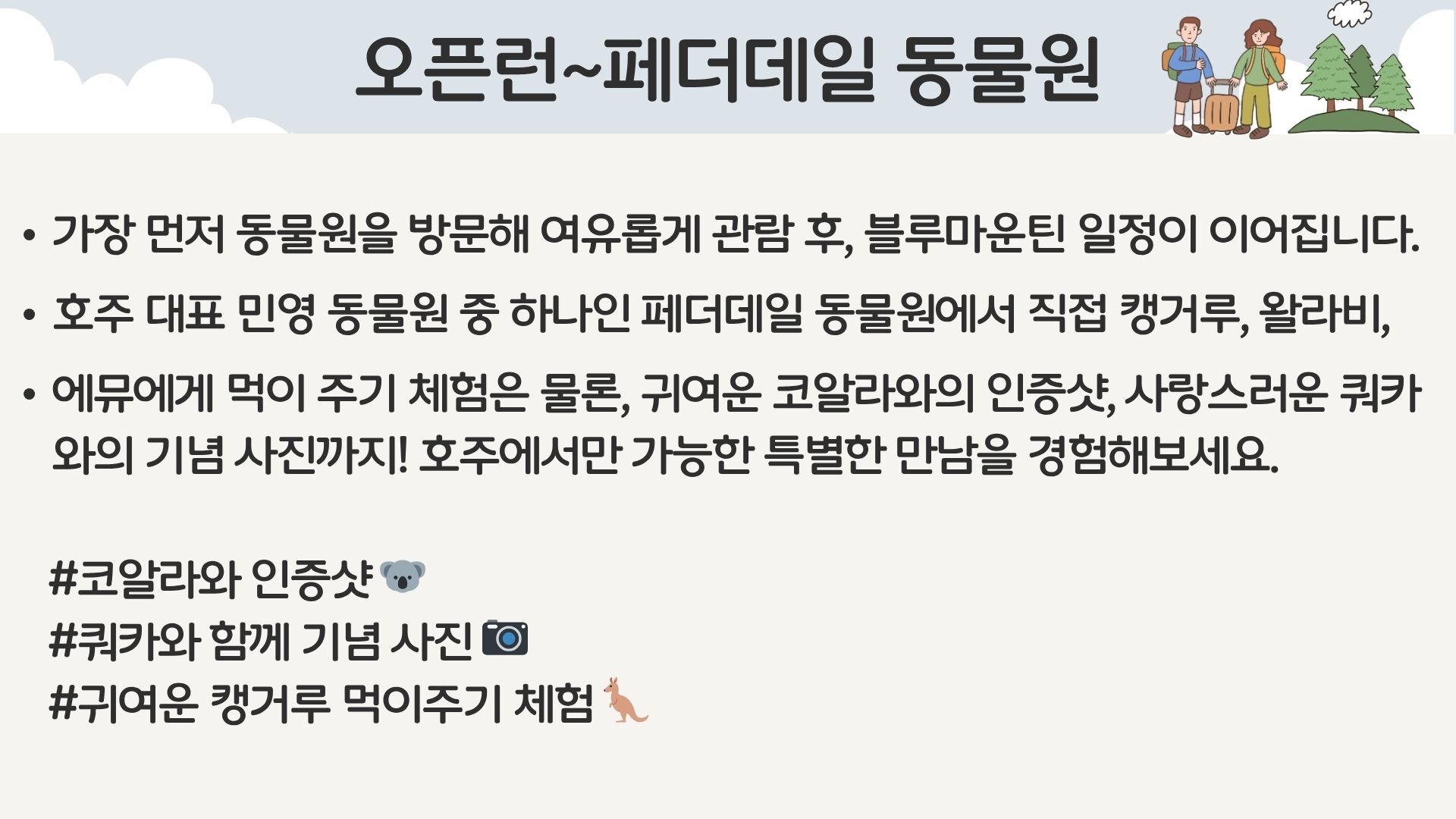 [*리얼*오픈런] 여유로운 90분 페더데일과 프리미엄 블루마운틴 감성여행 [놀러와 시드니] 평점 4.9617803580068 · 리뷰 4134건 포함 ■일일관광 전문 한국어 가이드 ■차량비 (톨비 포함) ■국립 공원 입장료 ■페더데일 동물원 입장료 ■[품격]시닉월드 입장료 불포함 - 개인비용 - 여행자 보험 - 중식 - [실속] 시닉월드 입장료 마이리얼트립에서 예약하기 시드니 목록 도시 목록