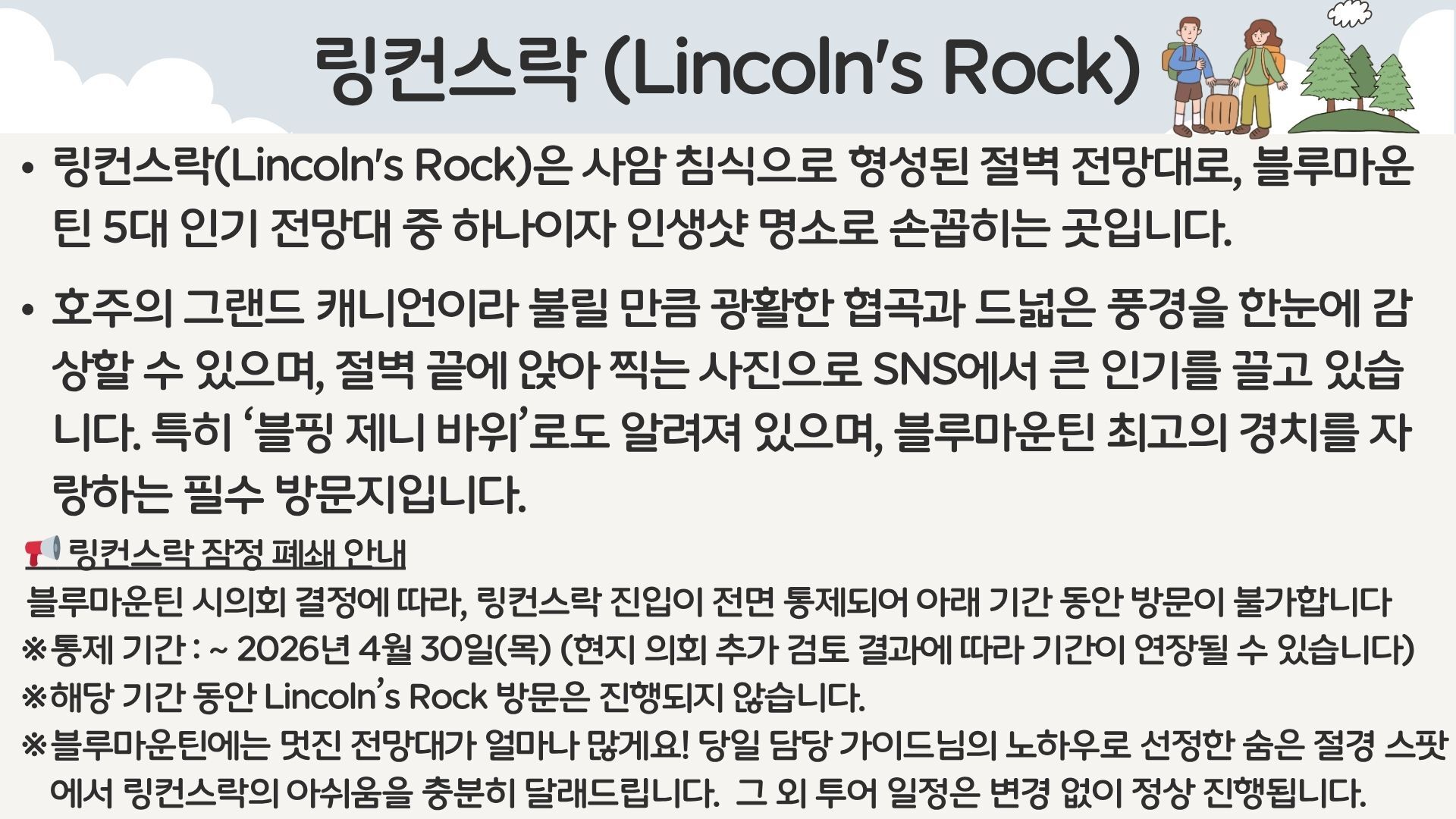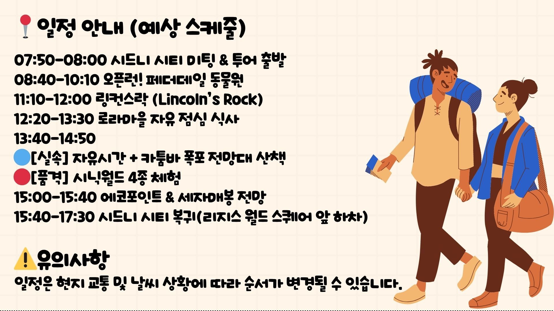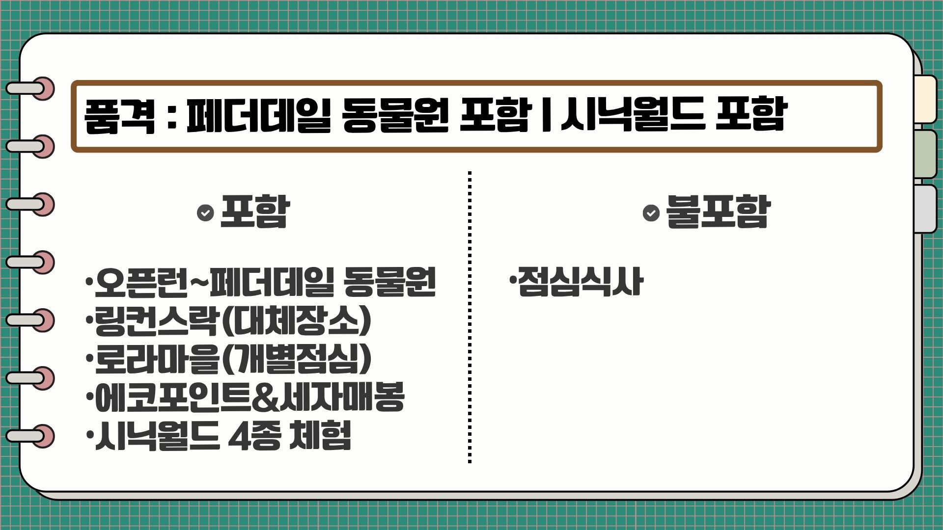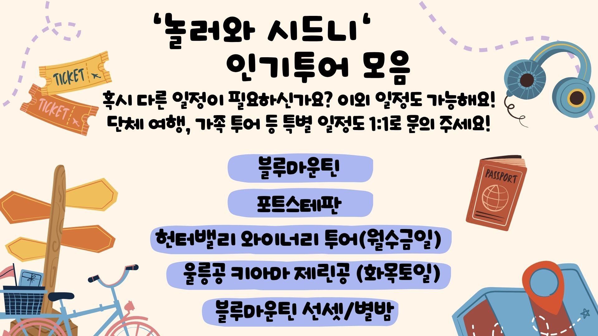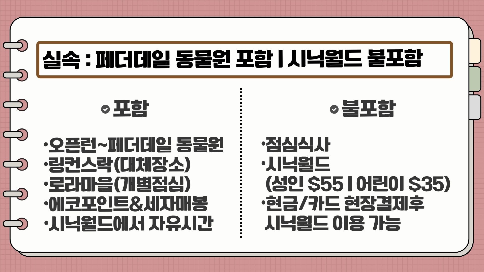[*리얼*오픈런] 여유로운 90분 페더데일과 프리미엄 블루마운틴 감성여행 [놀러와 시드니] 평점 4.9617803580068 · 리뷰 4134건 포함 ■일일관광 전문 한국어 가이드 ■차량비 (톨비 포함) ■국립 공원 입장료 ■페더데일 동물원 입장료 ■[품격]시닉월드 입장료 불포함 - 개인비용 - 여행자 보험 - 중식 - [실속] 시닉월드 입장료 마이리얼트립에서 예약하기 시드니 목록 도시 목록