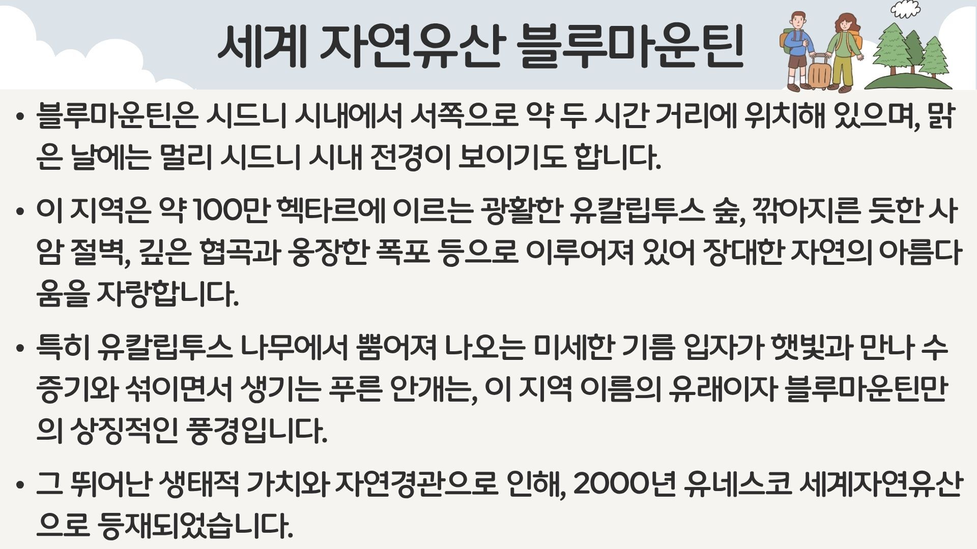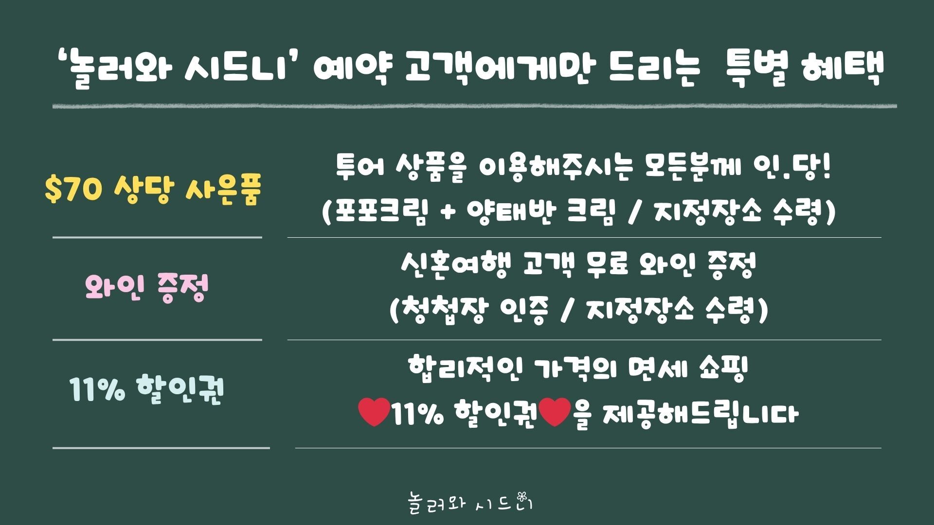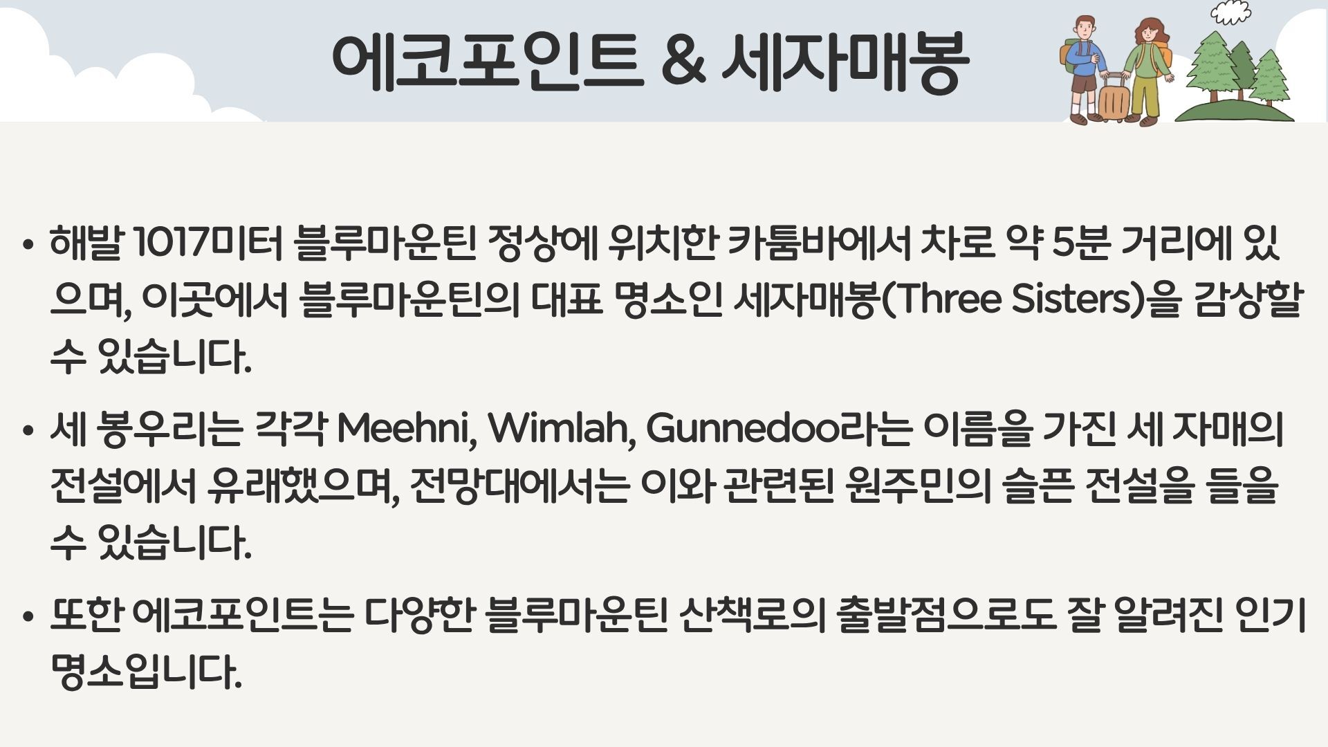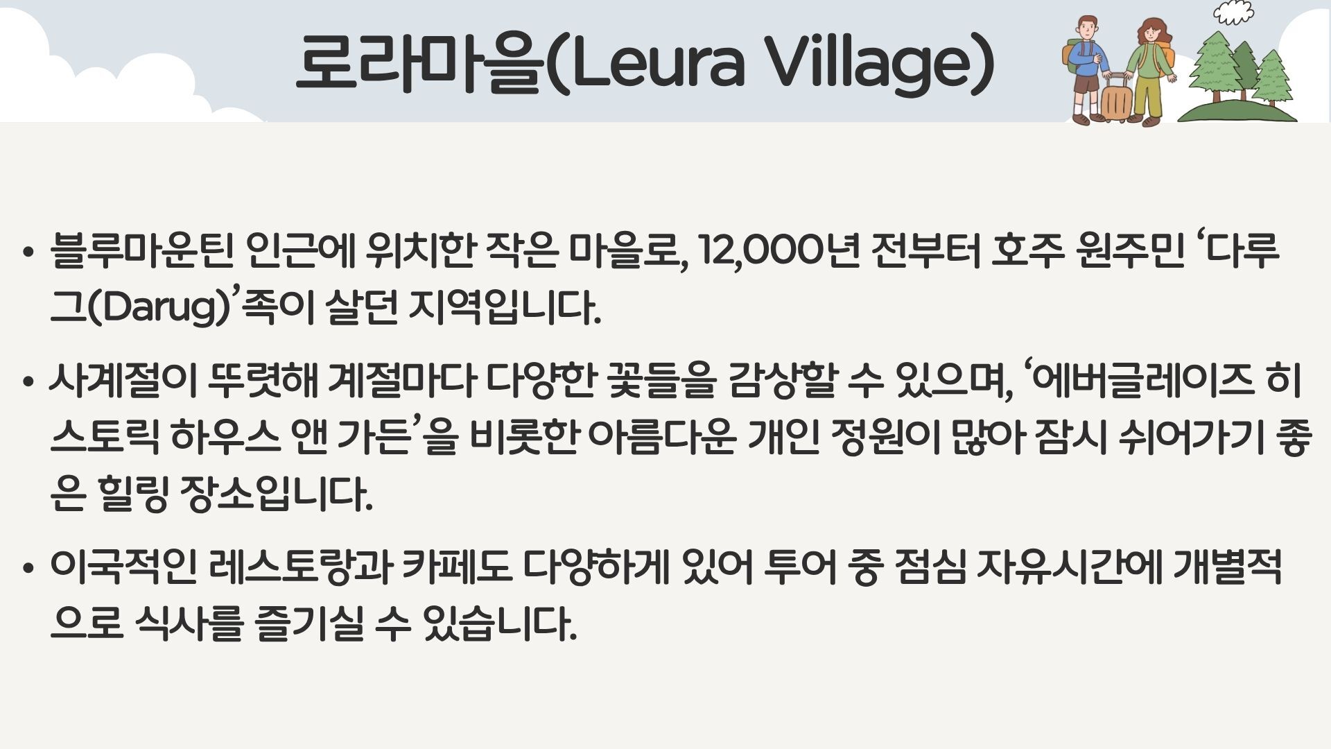 [*리얼*오픈런] 여유로운 90분 페더데일과 프리미엄 블루마운틴 감성여행 [놀러와 시드니] 평점 4.9617803580068 · 리뷰 4134건 포함 ■일일관광 전문 한국어 가이드 ■차량비 (톨비 포함) ■국립 공원 입장료 ■페더데일 동물원 입장료 ■[품격]시닉월드 입장료 불포함 - 개인비용 - 여행자 보험 - 중식 - [실속] 시닉월드 입장료 마이리얼트립에서 예약하기 시드니 목록 도시 목록