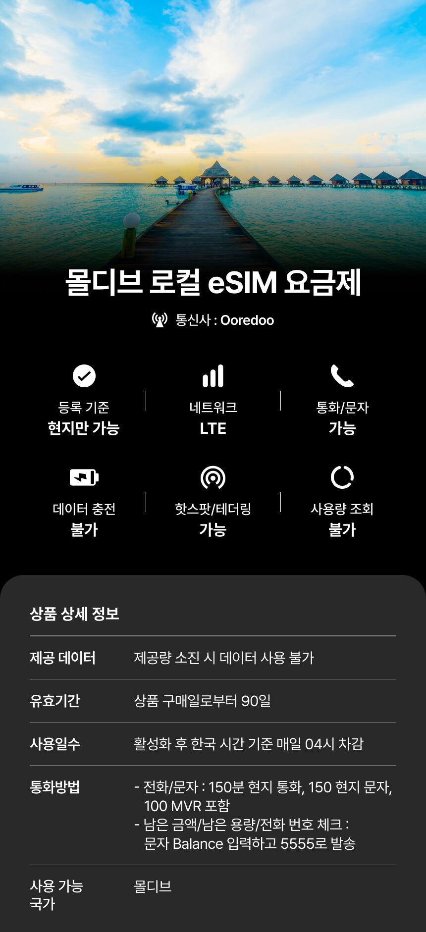몰디브 로컬 이심 eSIM 데이터 10일 20GB 평점 5 · 리뷰 2건 포함 - 선택한 옵션의 eSIM 불포함 - 개별 여행자 보험 마이리얼트립에서 예약하기 몰디브 목록 도시 목록