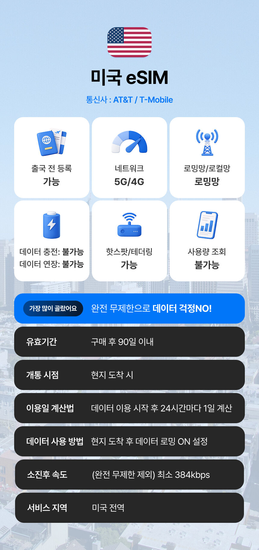 미국 이심 eSIM 뉴욕 LA 티모바일 매일 500MB 무제한 1일 유심사 알림톡 평점 4.0625 · 리뷰 16건 포함 구매하신 eSIM 바우처는 E-MAIL로 발송됩니다. 불포함 기타 개인 경비 마이리얼트립에서 예약하기 시애틀 목록 도시 목록