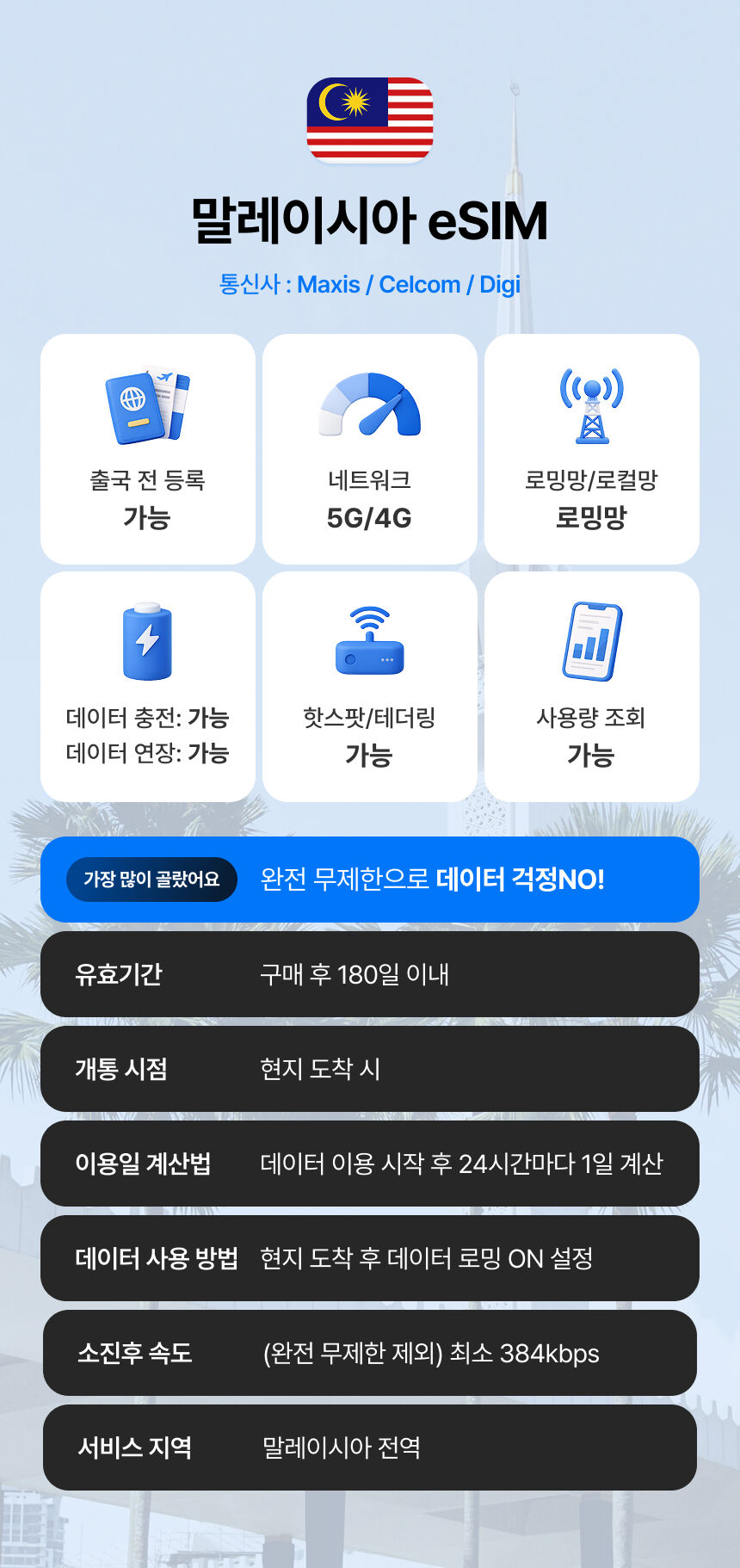 말레이시아 이심 eSIM 코타키나발루 디지 매일 500MB 무제한 1일 유심사 알림톡 평점 4.5 · 리뷰 38건 포함 선택한 옵션의 eSIM 불포함 기타 개인 경비 마이리얼트립에서 예약하기 페낭 목록 도시 목록