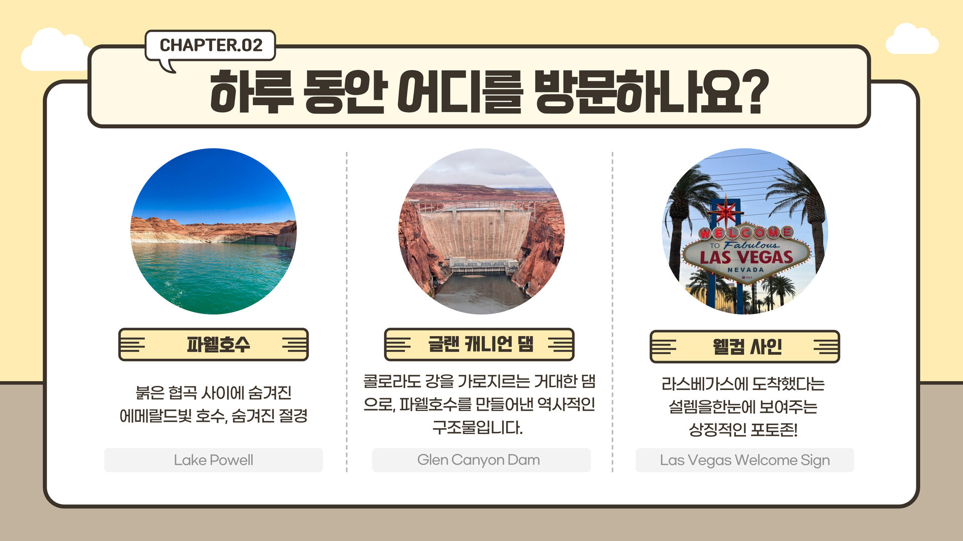 이제 도시를 떠나 아름답고 웅장한 자연을 여행을 해보아요