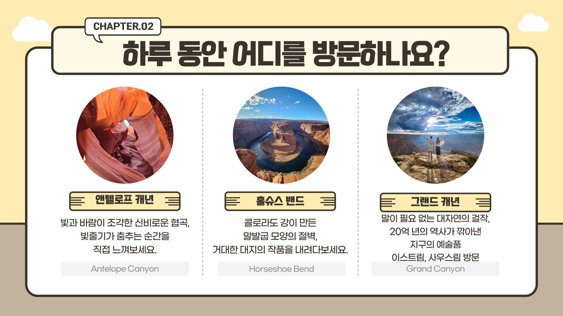 하루에 그랜드캐년과 앤텔로프캐년 그리고 홀스슈밴드까지 보실 수 있는