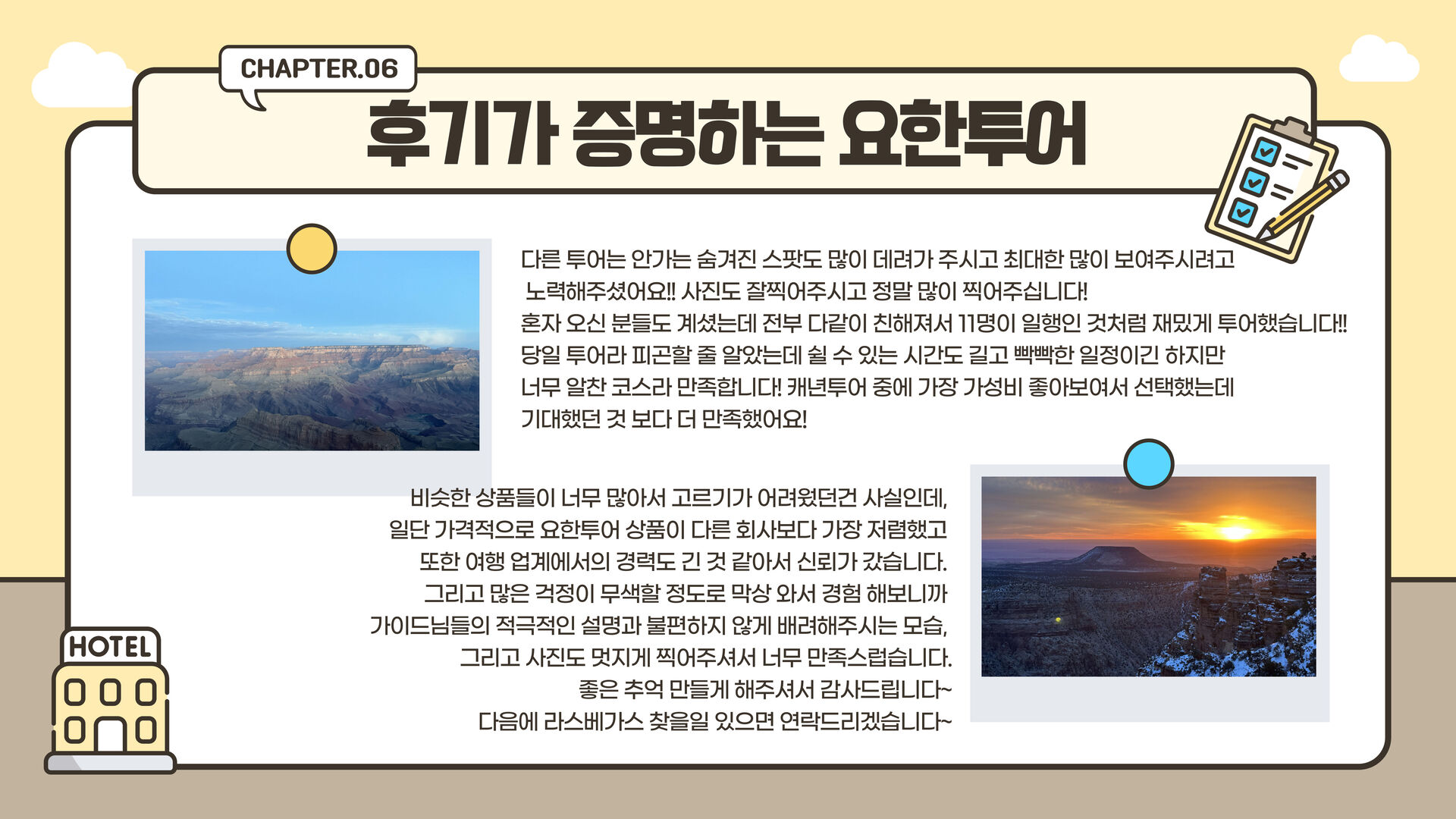 저희 회사는 믿고 선택해주신 만큼 잊지 못할 추억을 만들어 드릴 것을 약속합니다.