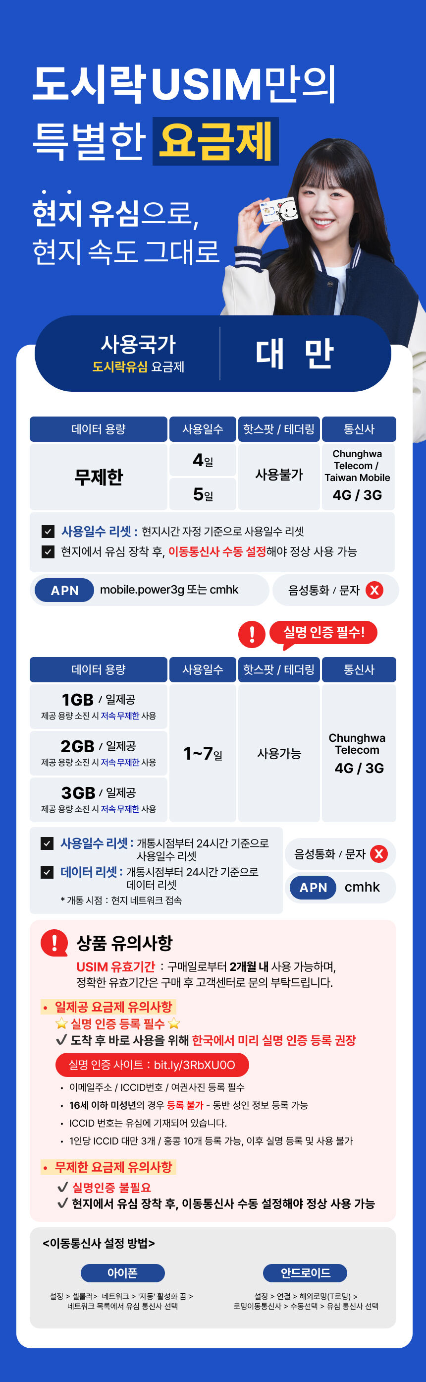 [대만유심] 데이터 무제한 타이베이 가오슝 타이루거 유심칩 공항수령 평점 4.2140649149923 · 리뷰 1294건 포함 현지유심 + 유심 추출핀 + 메뉴얼 등 불포함 그 외 상품 및 비용 마이리얼트립에서 예약하기 가오슝 목록 도시 목록