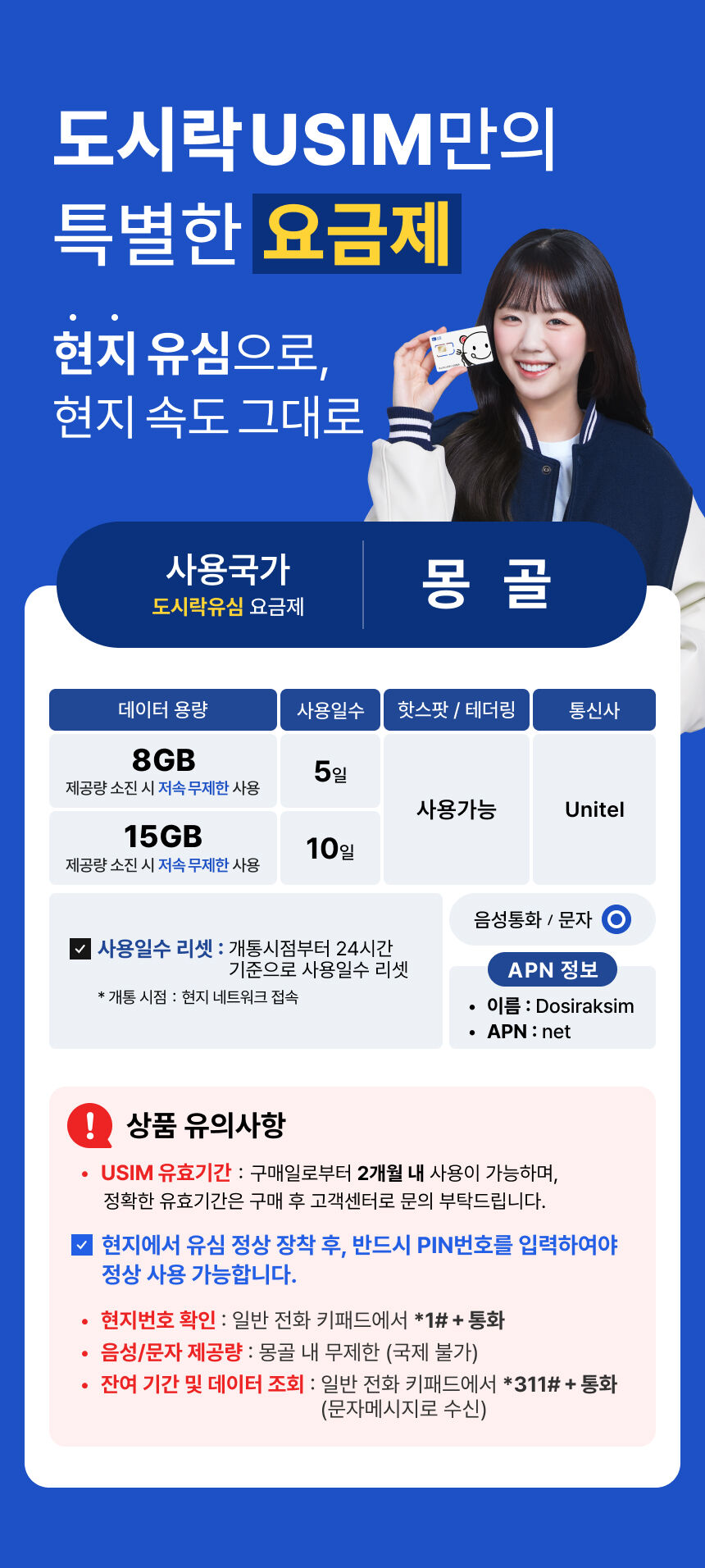 [몽골유심] 데이터 무제한 현지통화 무료 울란바토르 유심칩 인천공항 수령 본문: 로컬 DB 동기화 상세 평점 4.8 · 리뷰 24건 포함 현지유심 + 유심 추출핀 + 메뉴얼 등 불포함 그 외 상품 및 비용 마이리얼트립에서 예약하기 인천 목록 도시 목록