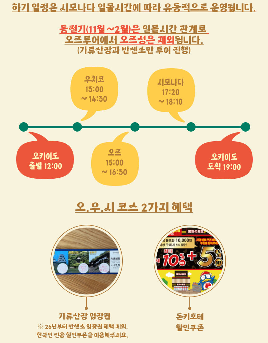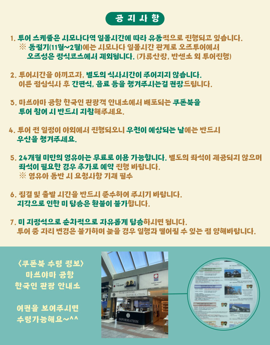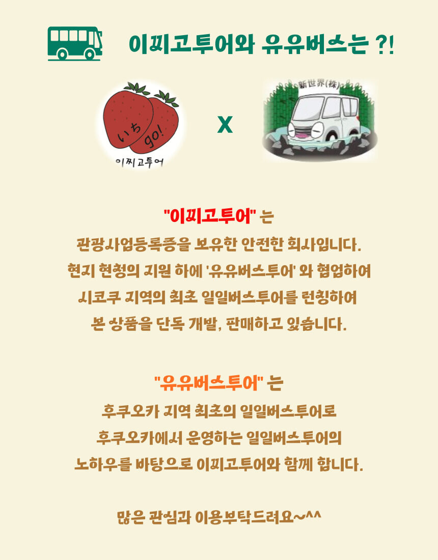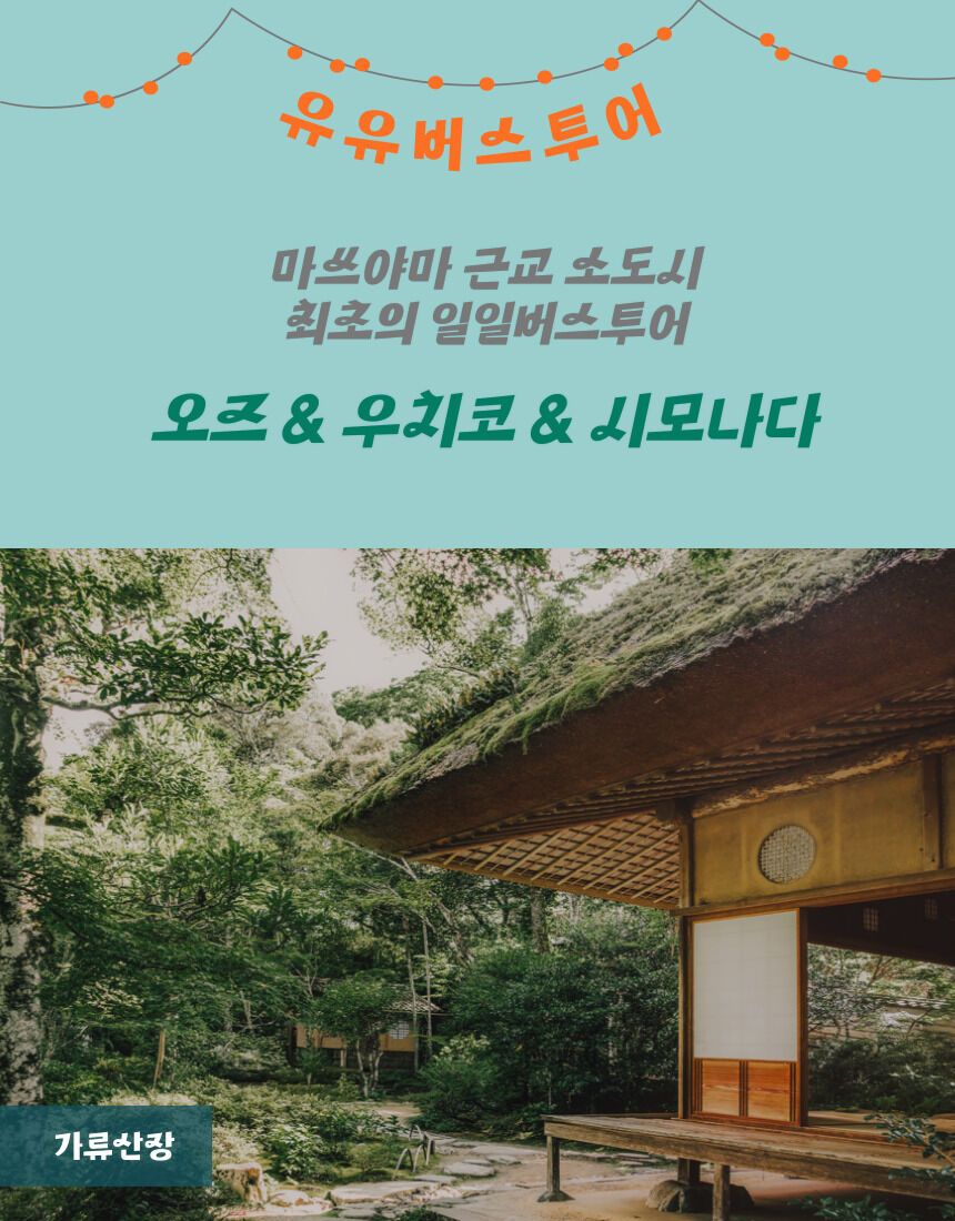 [유유버스투어] 마쓰야마 근교 일일 버스투어 평점 4.6378737541528 · 리뷰 301건 공지사항 및 상품소개를 반드시 필독 바래요~^^유선문의는 불가할 수 있으니문의는 가능한 '대화방'을 이용해주세요! 포함 가이드를 동반한 일일 버스 이용 상품소개에 명시된 혜택 불포함 현지 식비 및 기타 개인 경비 개별 여행자 보험 (여행 전 개별 여행자 보험 가입을 권장) 마이리얼트립에서 예약하기 마쓰야마 목록 도시 목록
