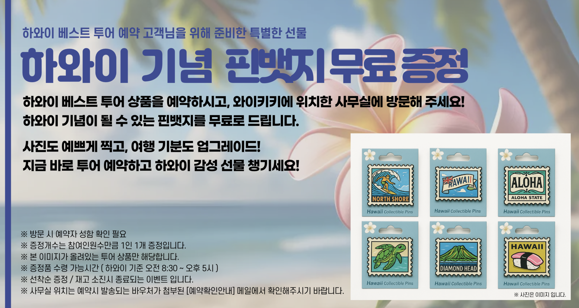 - 교통편: 와이키키 내 지정 호텔에서 픽업이 이루어 집니다. (픽업시간은 오후 4시 20분부터 시작)