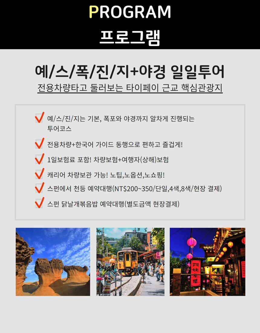◎ 대만 관광법에 의거하여 1일 여행자(상해)보험과 차량보험을 가입하고 있습니다.