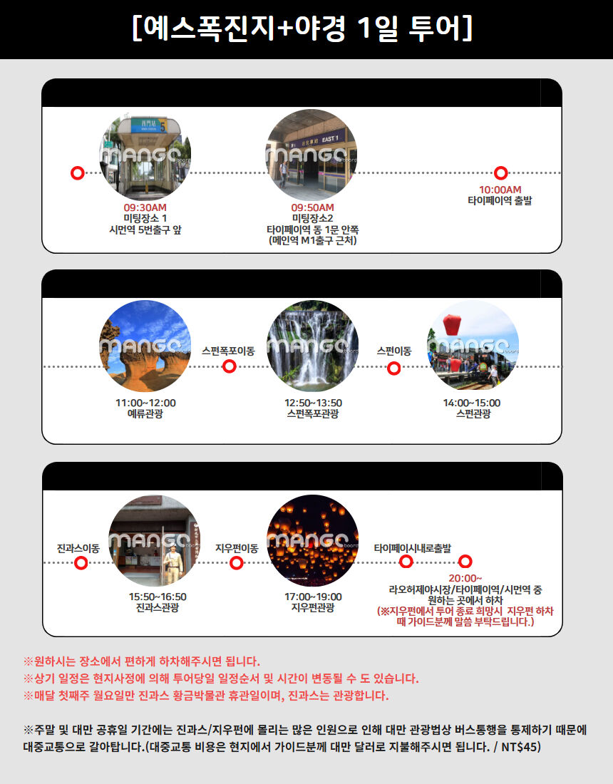 - 1. 예류 해양공원 입장료(성인NT$120/12세이하NT$60) 2. 스펀 천등(NT$200-350/단일 색, 4가지 색, 8가지 색) → 자유 선택 3. 진과스 황금박물관 입장료(NT$80), 광부도시락(NT$190) 4. 식사비용 및 기타 개인경비 5. 주말 및 대만 공휴일 대중 교통비용(대만달러 NT$45 현지 지불)