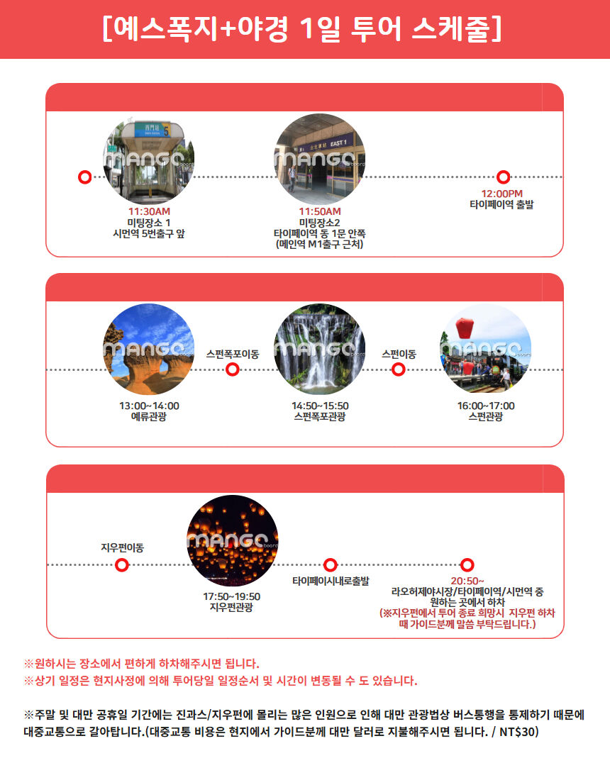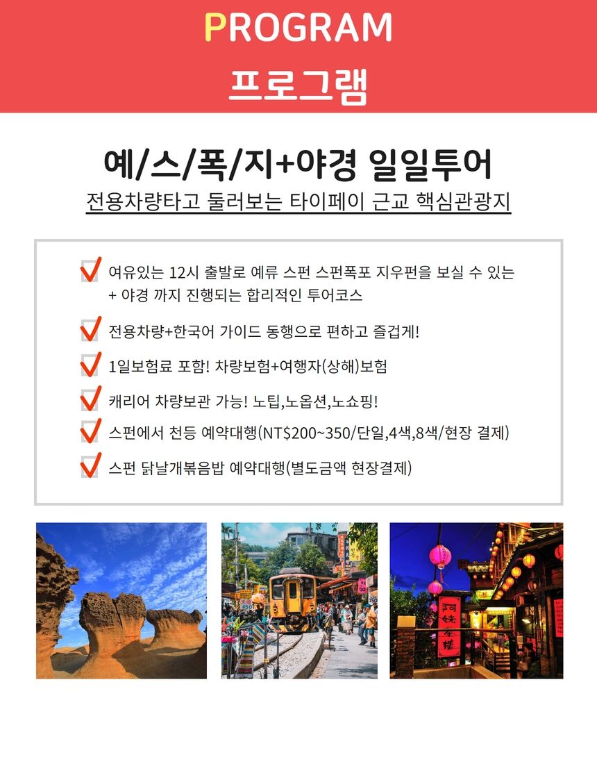 - 1. 예류 해양공원 입장료(성인NT$120/12세이하NT$60) 2. 스펀 천등(NT$200-350/단일 색, 4가지 색, 8가지 색) → 자유 선택 3. 식사비용 및 기타 개인경비 4. 주말 및 대만 공휴일 대중 교통비용(대만달러 NT$30 현지 지불)