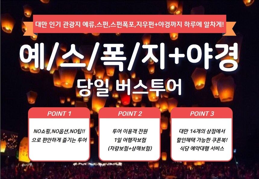 [100%출발! 예스폭지+야경] 12시출발 대만버스투어 시먼역/메인역 탑승&야시장 하차가능