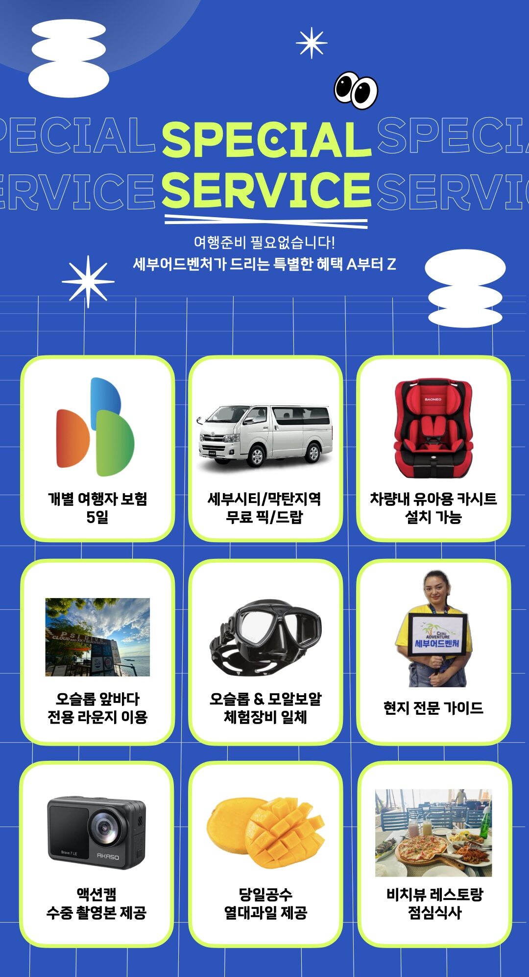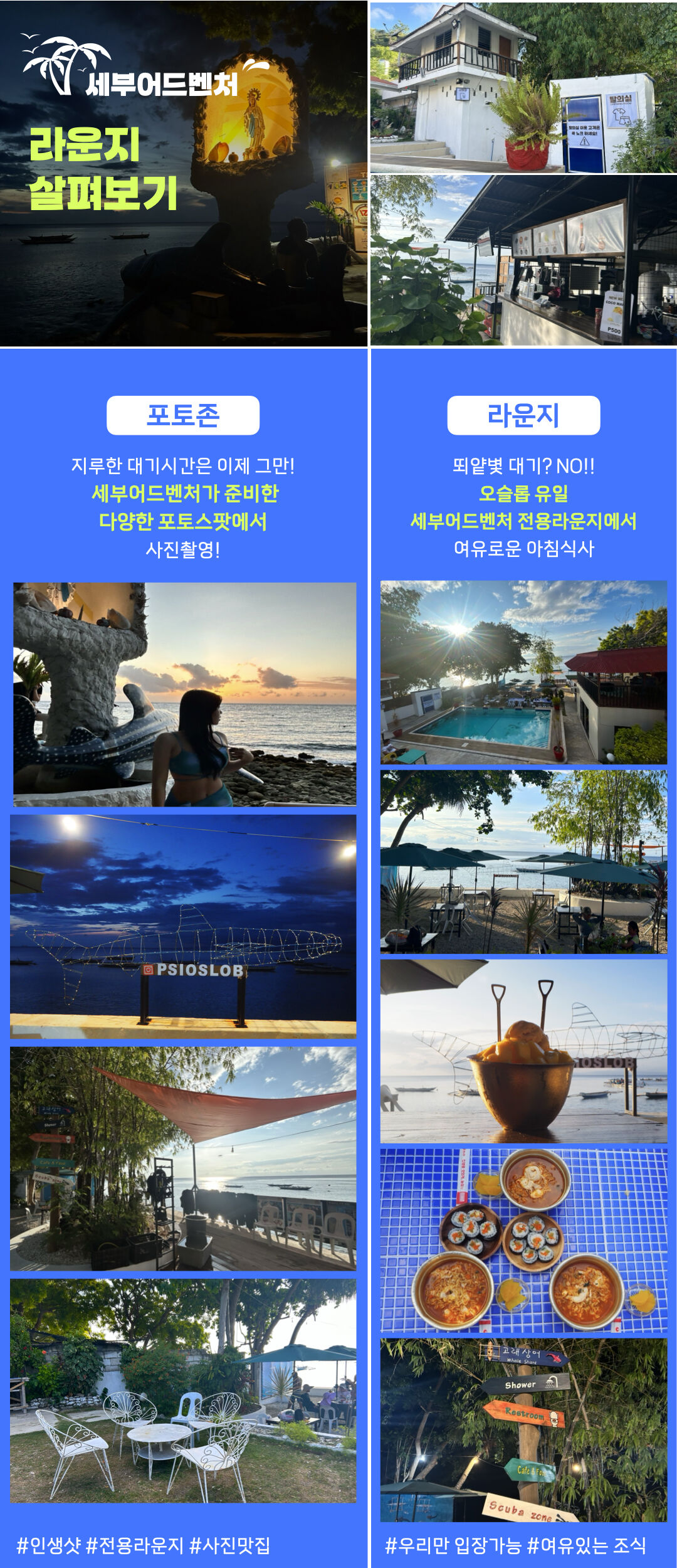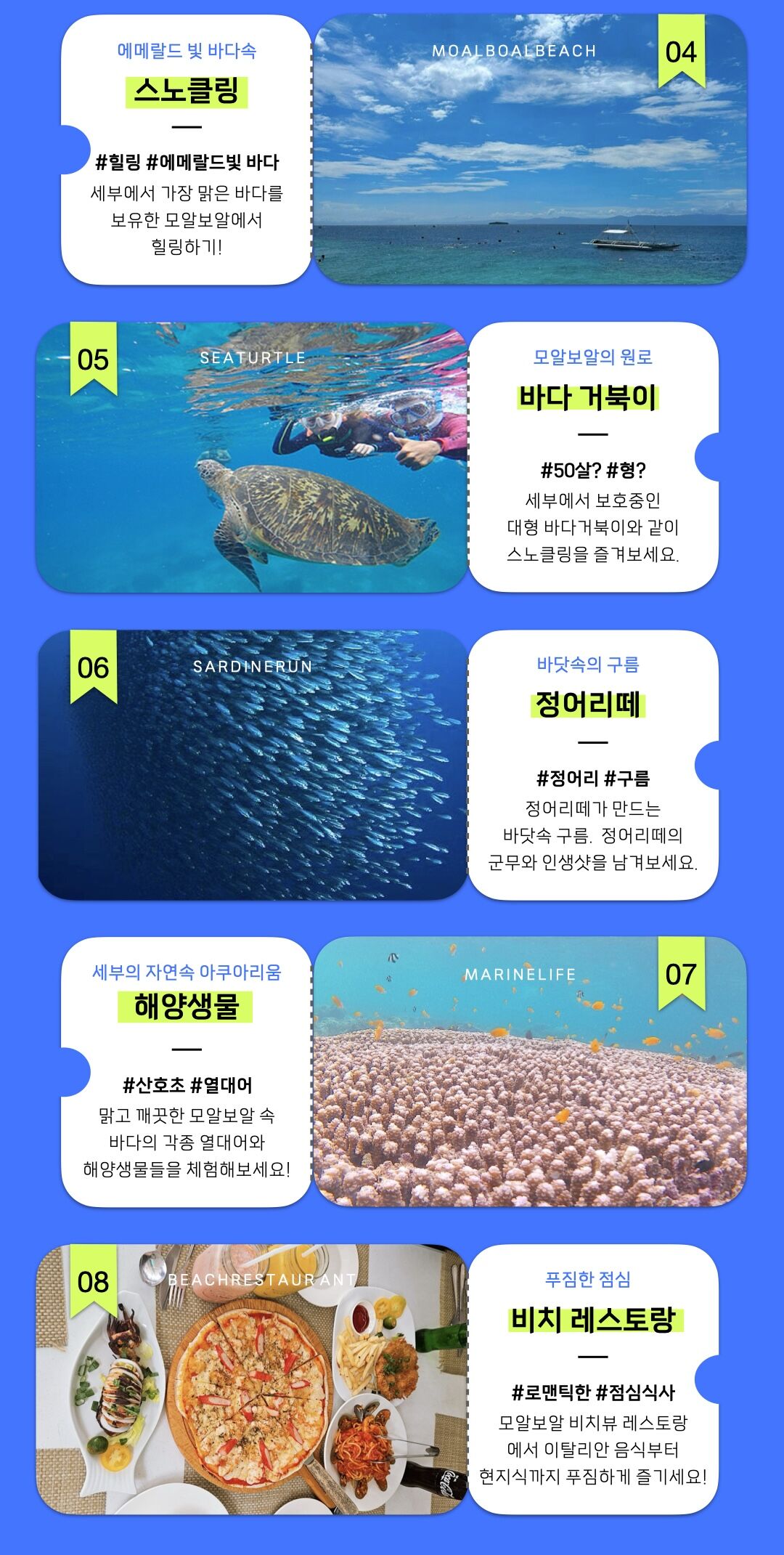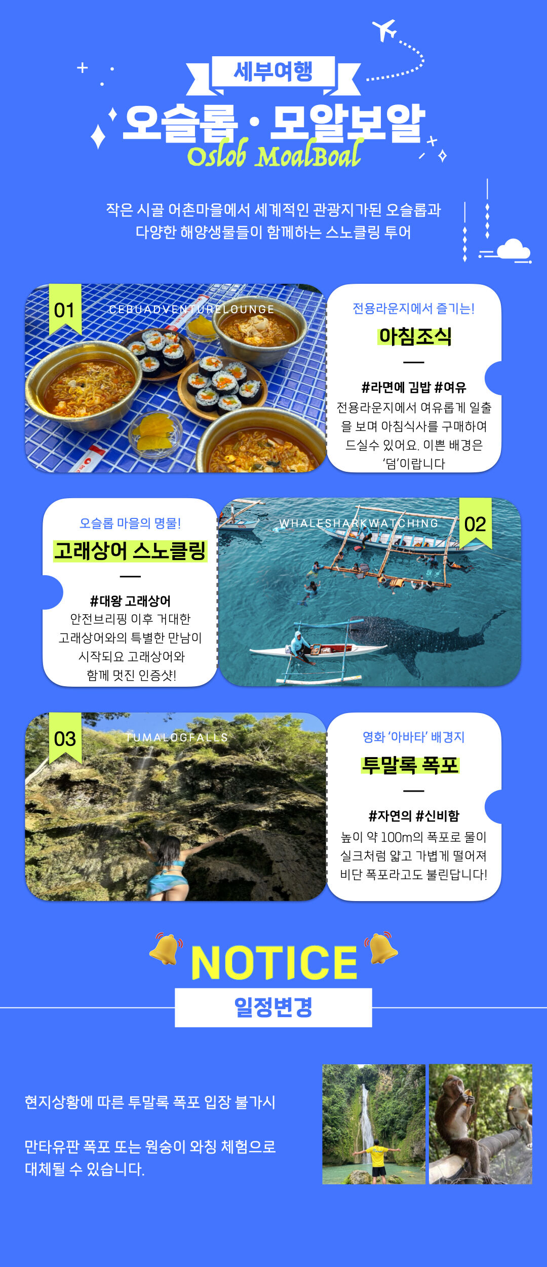 [보험5일가입무료]단독투어 오슬롭x모알보알 평점 5 · 리뷰 36건 포함 • 여행자보험 • 픽/드랍 • 카시트(요청시) • 라운지이용 • 체험장비 일체 • 현지인 가이드 • 수중촬영본 • 열대과일(망고) • 점심식사 • 수건 • 물 불포함 ✕ 아침조식 마이리얼트립에서 예약하기 세부 목록 도시 목록