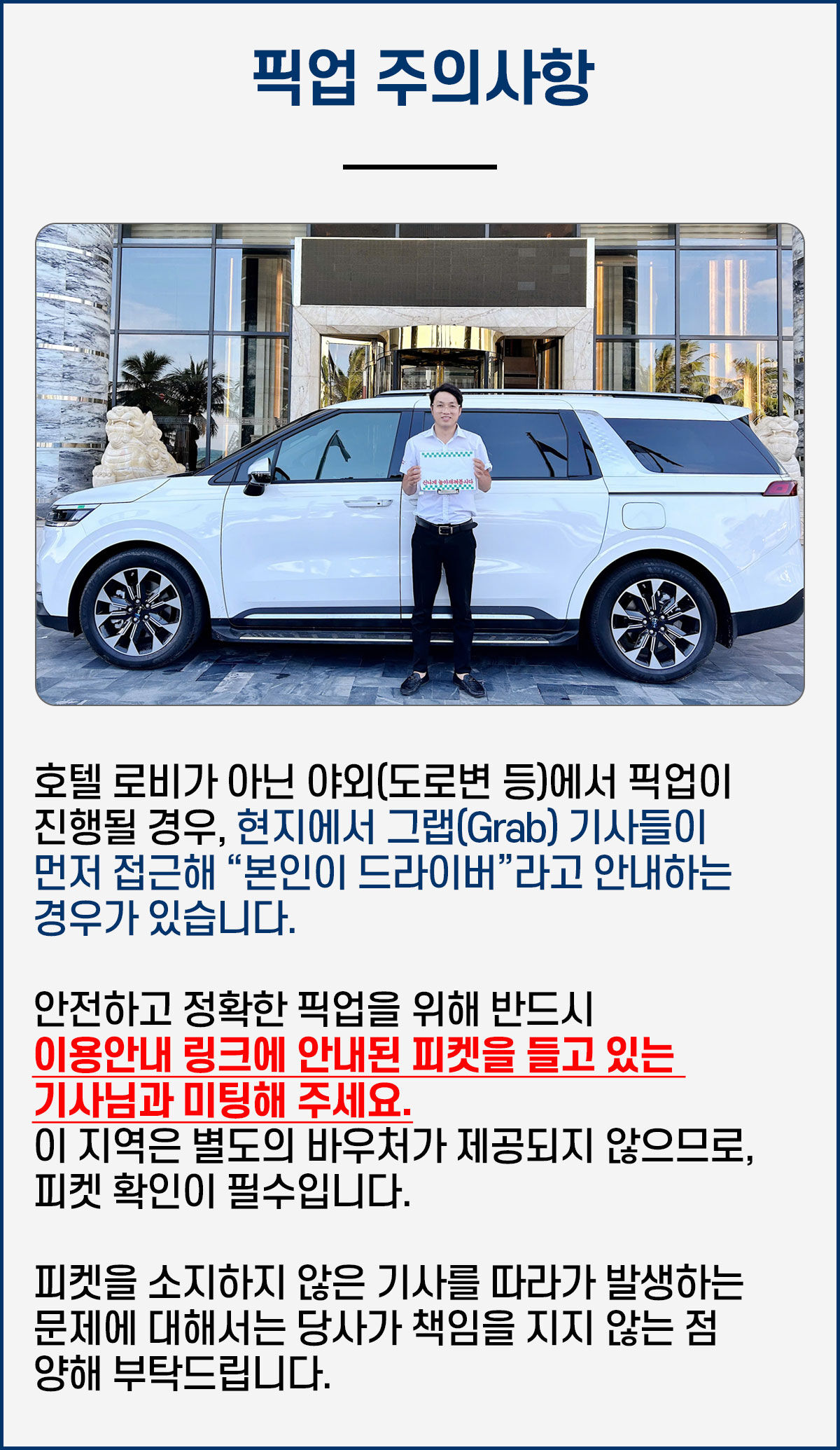 → 공항 픽업은 실제 비행기 도착 시간 기준, 입국 수속 시간을 고려하여 기사님이 미팅장소에서 피켓을 들고 대기합니다.