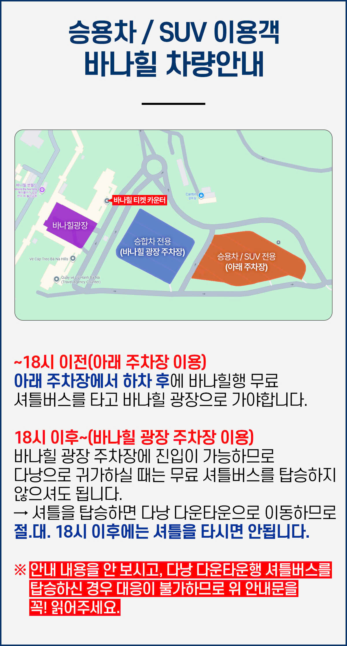 2. 승용차 / SUV는 18시이후에는 바나힐 광장 주차장에 진입이 가능하므로 다낭으로 귀가하실때는 무료 셔틀버스를 탑승하지 않으셔도됩니다.