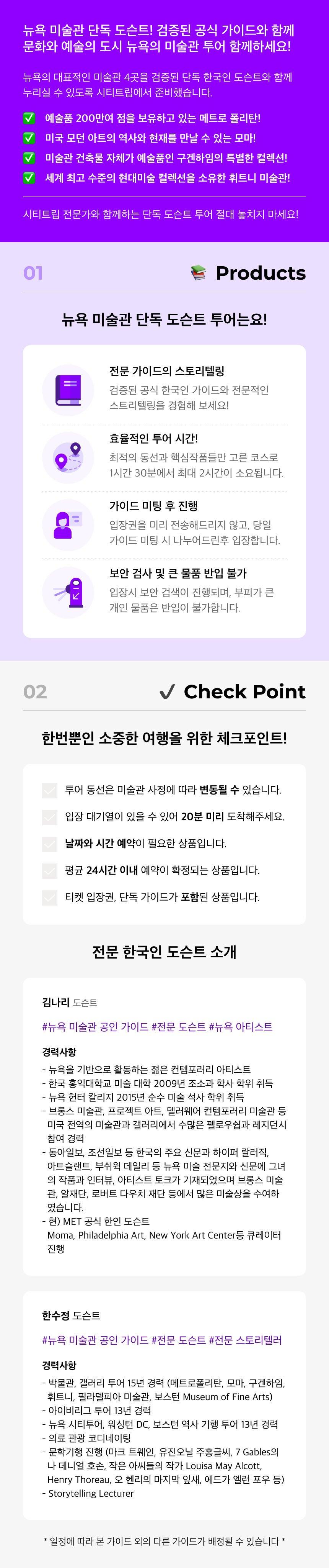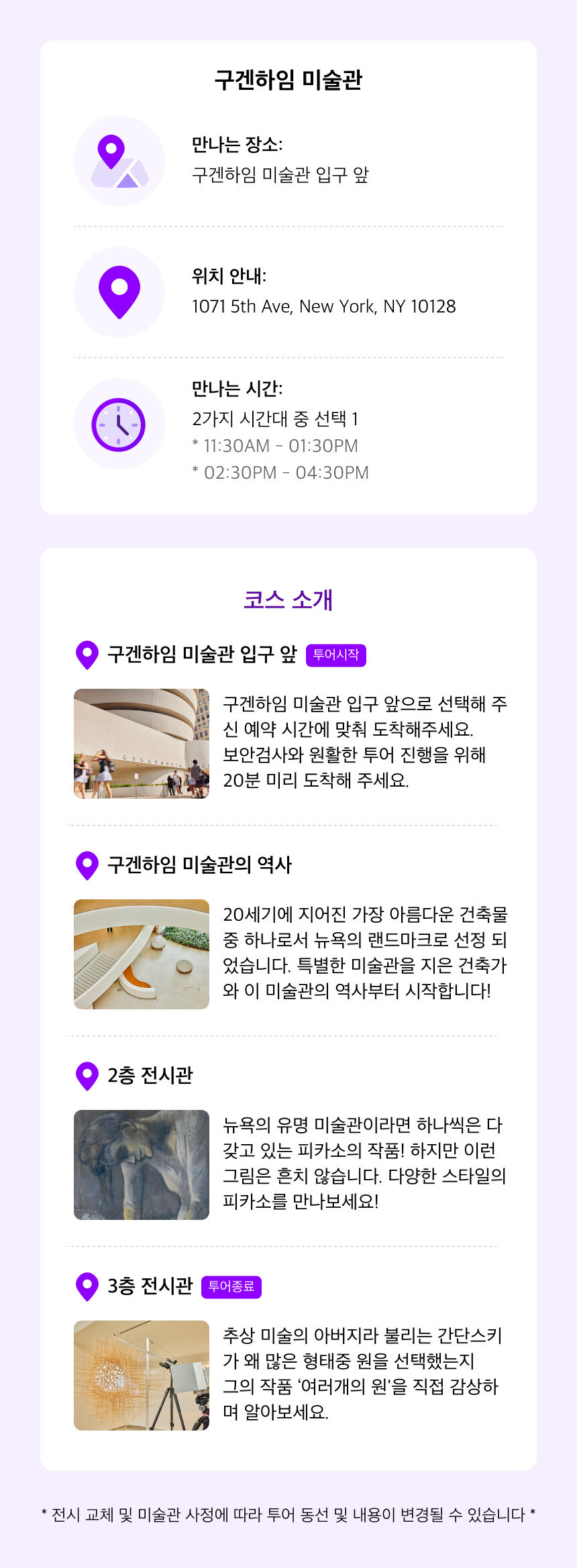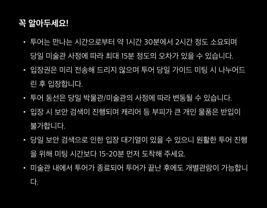 [시티트립] 뉴욕 구겐하임 미술관 프라이빗 단독 도슨트 투어 *입장권포함 평점 5 · 리뷰 1건 포함 가이드 투어 비용 가이드 팁 미술관 입장권 불포함 개인 여행 경비 여행자 보험 마이리얼트립에서 예약하기 뉴욕 목록 도시 목록