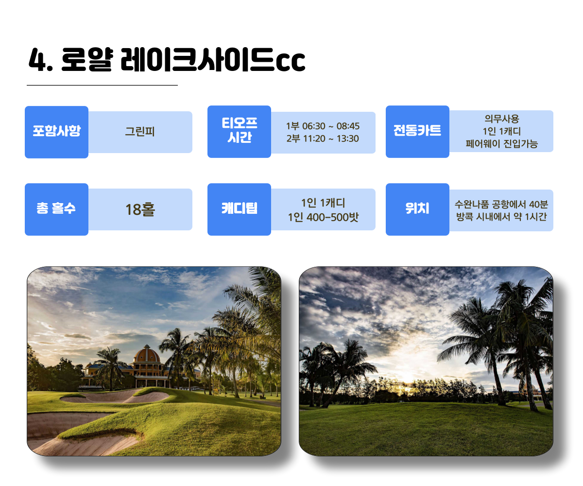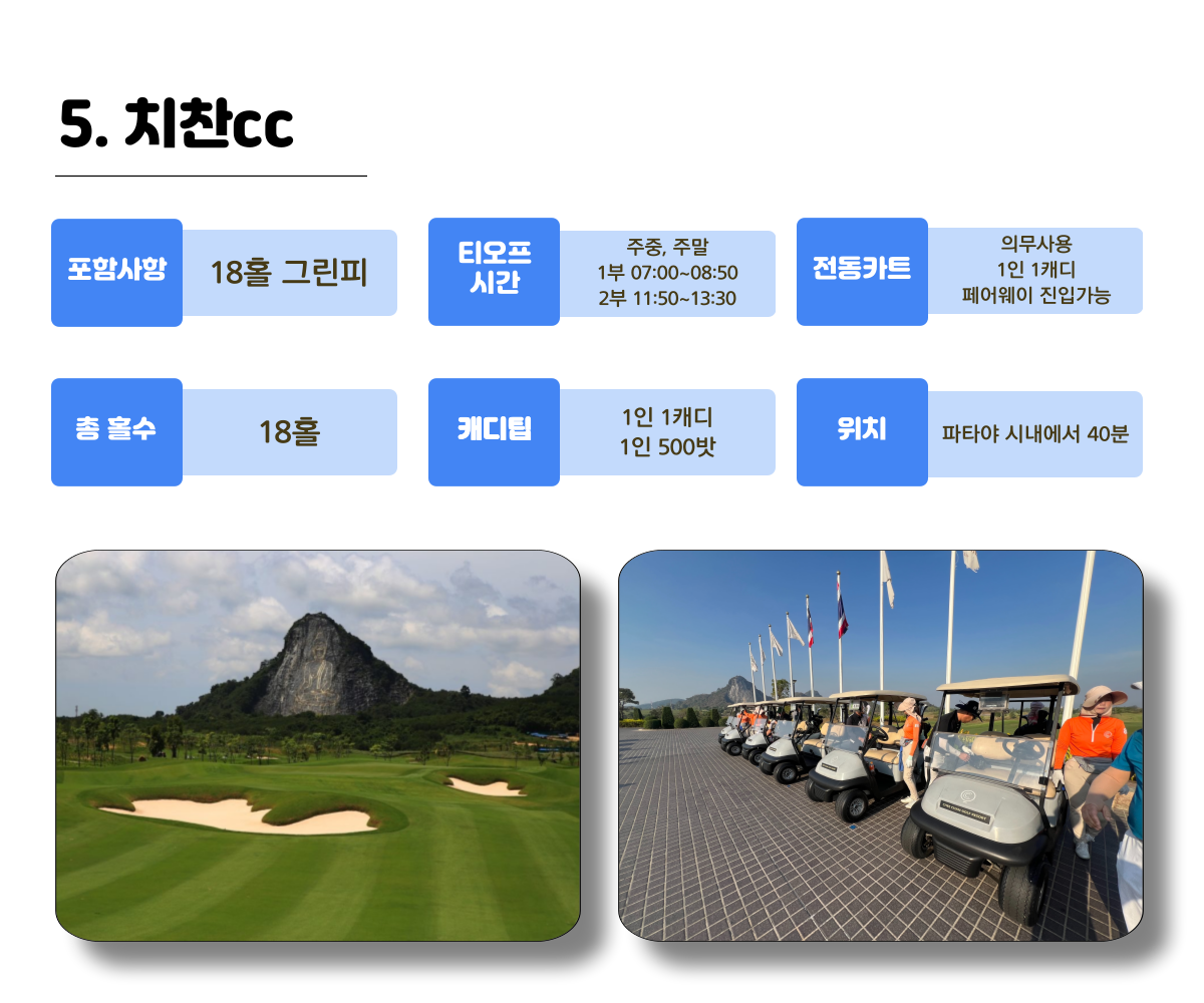 - • 왕복항공권 • 개인 매너팁 및 기타 개인경비 • 중,석식 불포함 • 미팅&샌딩비 // 2인(120$/인) // 3인(80$/인) // 4인 이상(50$/인) • 카트비/캐디피/캐디팁 • 18홀 기준 1인 800/400/400(시암,치찬 500밧) <카트비,캐디피 현지실장에게 지불>