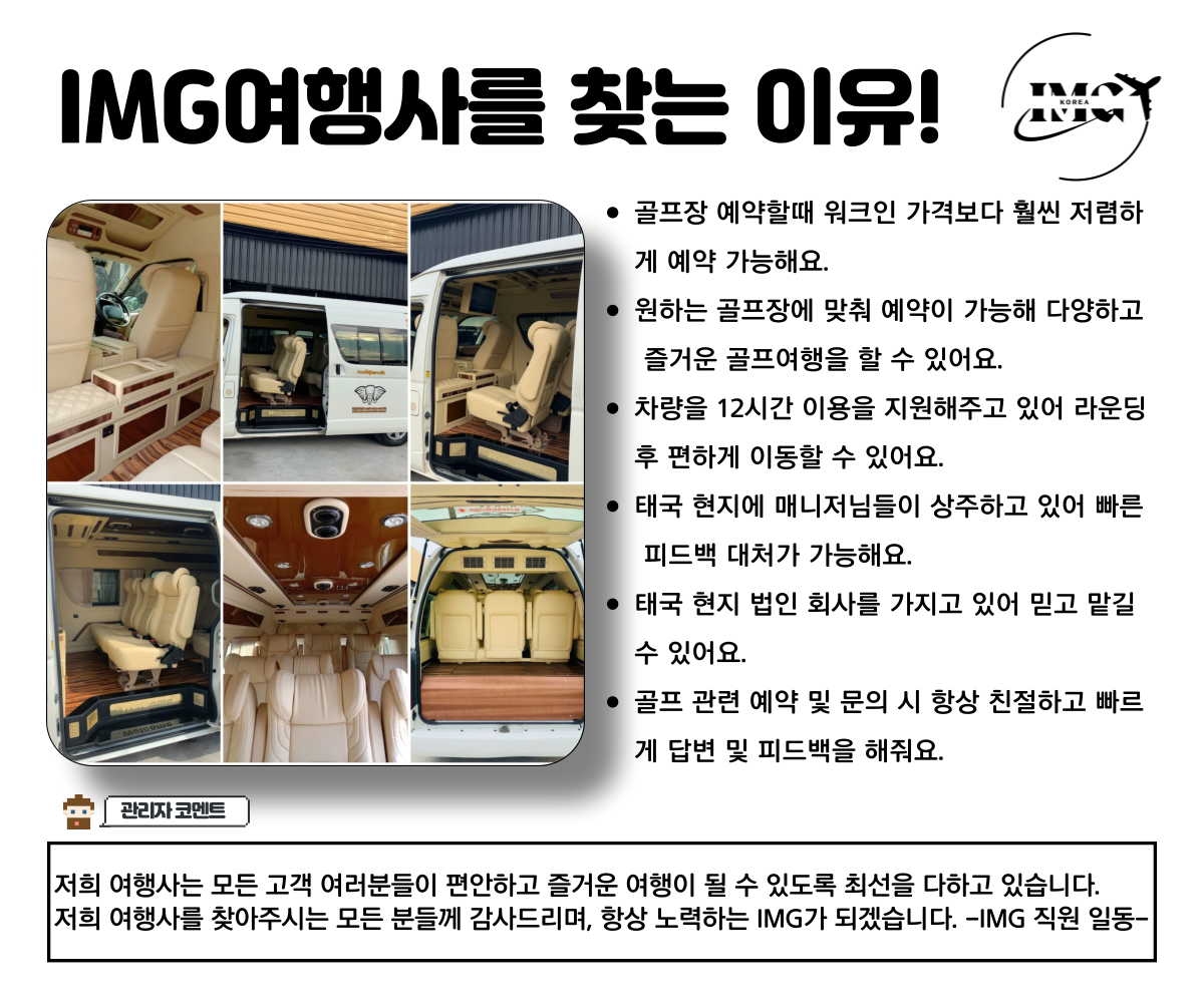 - • 3색 골프 18홀 총 54홀 그린피 • 호텔 2인 1실 +조식 • 11인승 Van 단독 차량 및 유류비 , 톨비 <1일 12H 기준>