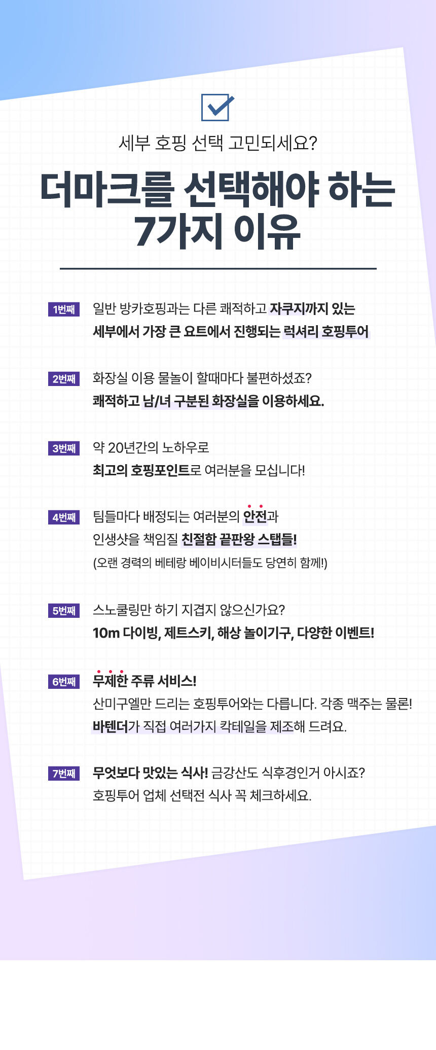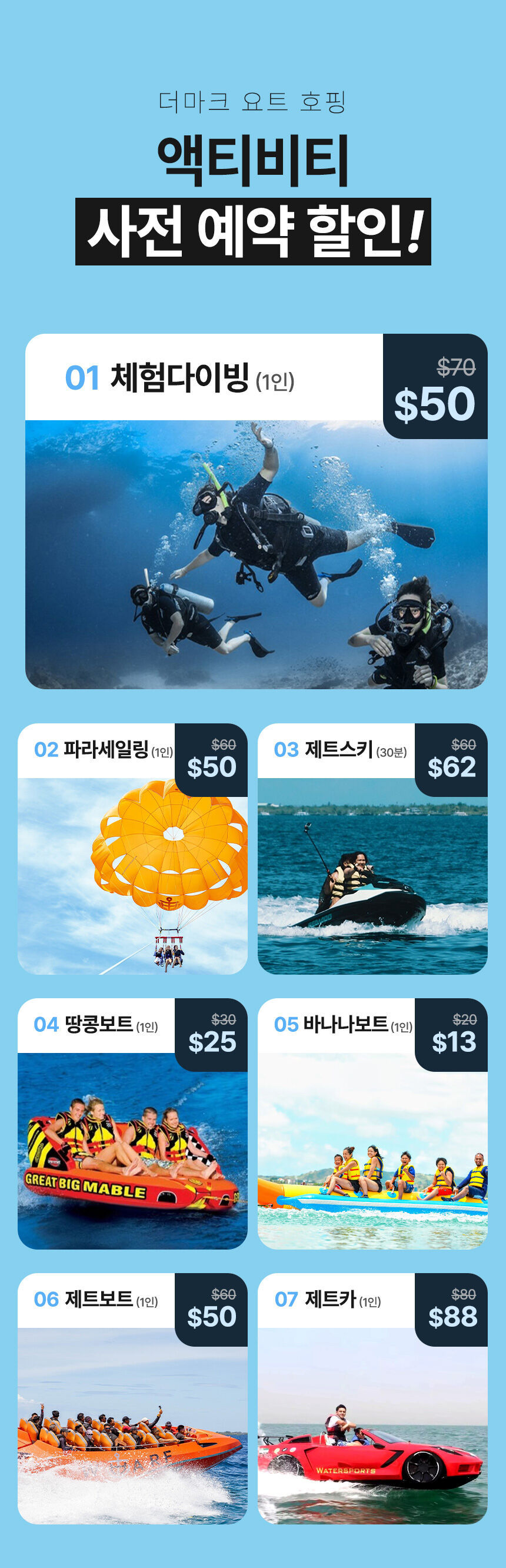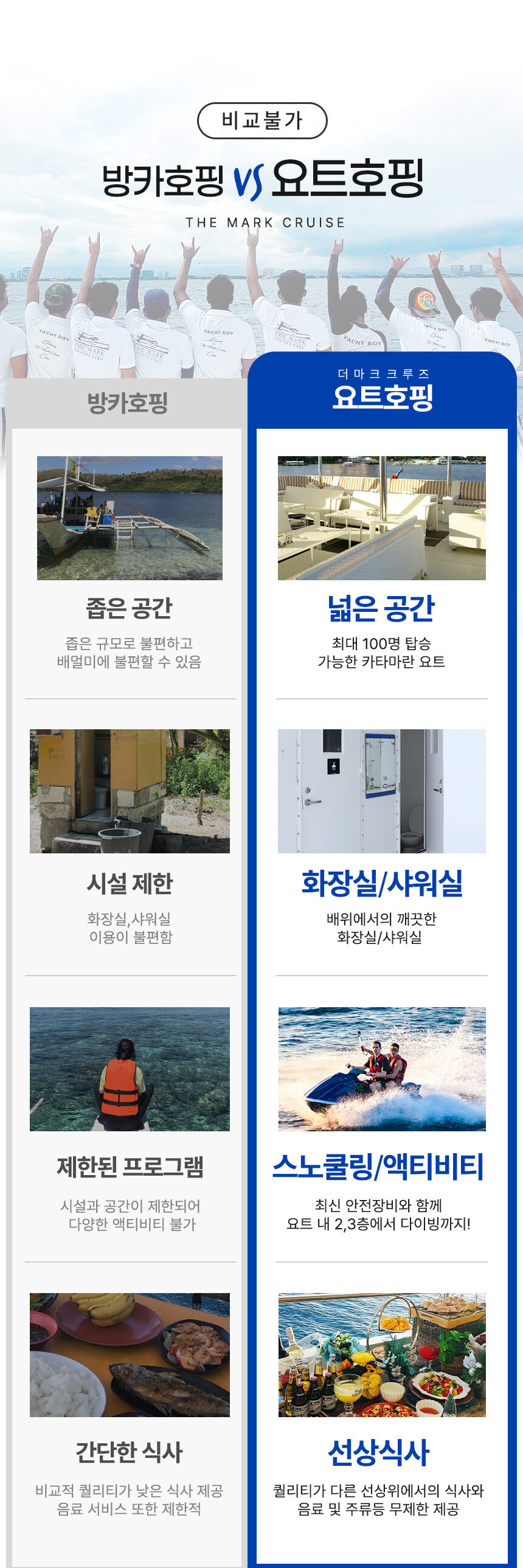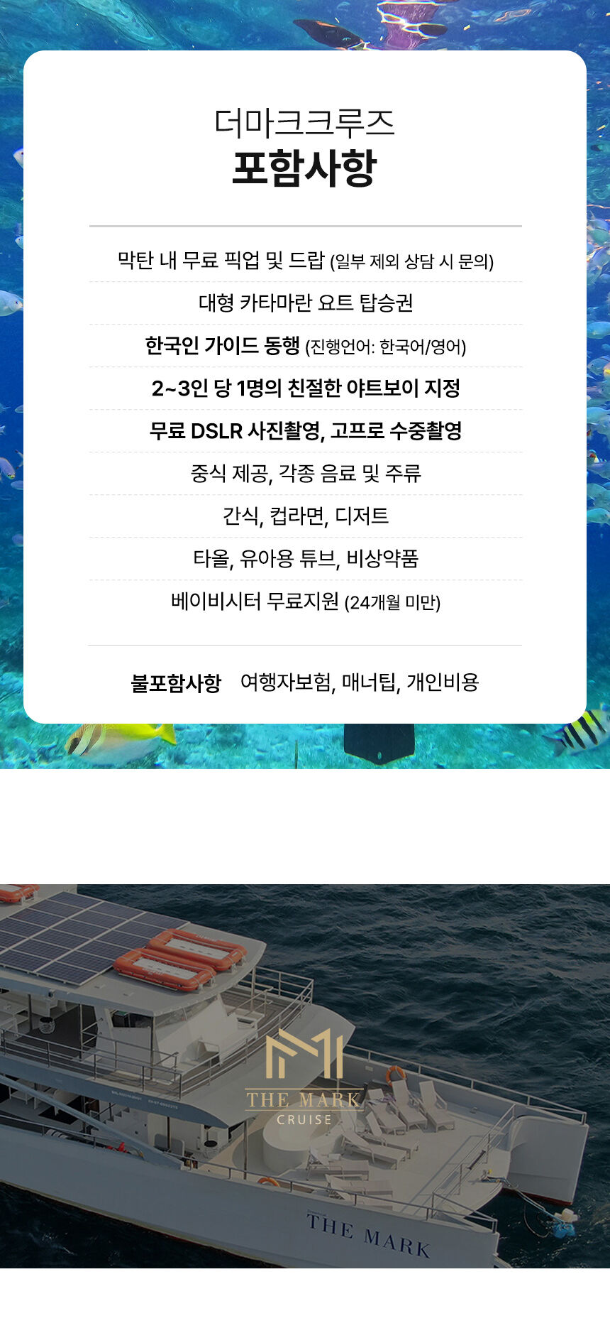 - 막탄 내 무료 픽업 및 드랍 (일부 제외 상담시 문의) 카타마란 요트 탑승권 한국인 가이드 동행 2~3인당 1명의 친절한 야트보이 지정 무료 DSLR사진촬영, 고프로 수중촬영 제트스키 무료 탑승 스노클링 장비대여 (2회 약 30분) 국립해양공원 입장료 선상중식뷔페 제공(세부 맛집 카바나 레스토랑) 와인 / 칵테일 / 럼주 / 삼페인 / 음료 무료 간식/ 컵라면 / 디저트 제공 타올 제공 유아용 튜브 비상약품 베이비시터 무료지원 (24개월 미만)