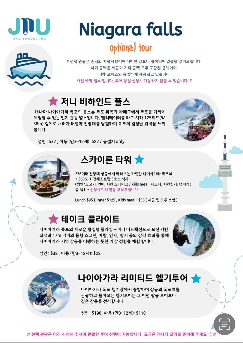 - - 호텔 (요청하시면 예약 및 진행 도와드립니다~) - 식사비 - 선택관광 (혼블로워 크루즈, 헬기투어, 젯보트, 스카이론타워) - 운전 및 투어 진행 가이드 님 팁 (1인/ 20 CAD x2일=40 CAD)