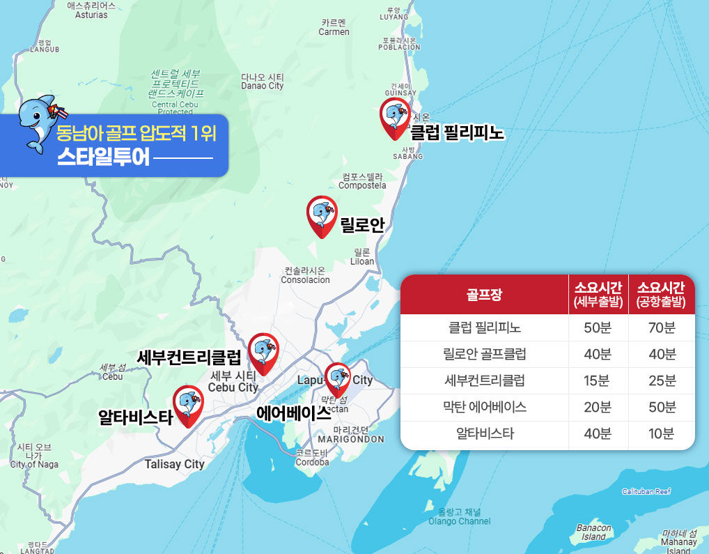 막탄과 세부시티에서 차량으로 약 40분~60분정도의 거리에 위치한 푸른하늘과 에메랄드빛 바다를 가진 필리핀 세부의 명문 골프장 클럽 필리피노 18홀