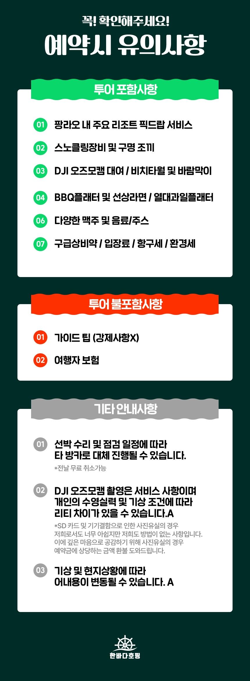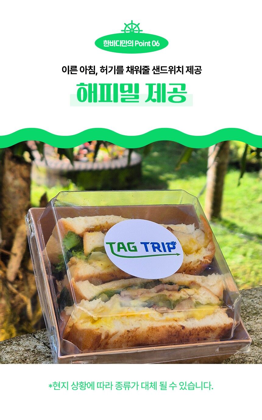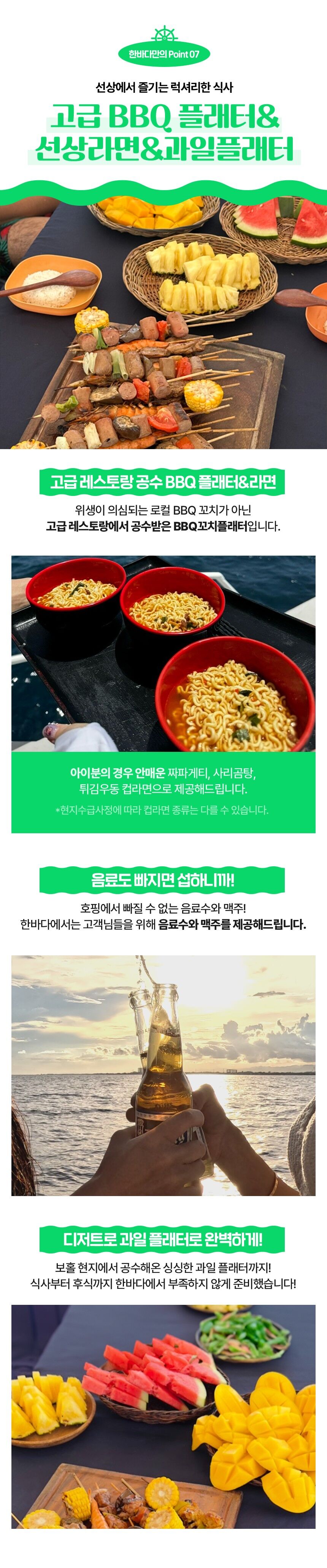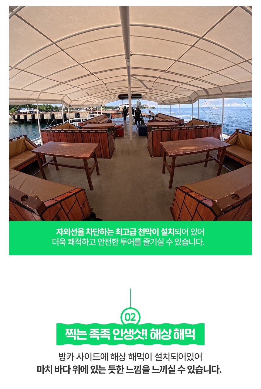 - - 한국인 호핑 스텝 참여 - 호핑현지 스텝 2~3인당 1명 배정 - 선상라면, 선상 간식 음료, 생수, 맥주, 열대과일,선상 BBQ - 선상 촬영 및 수중 촬영 (유투버들한테 핫한 DJI오즈모캠 촬영) - 짐보관 서비스 - 비상약품 - 비치타월, 스노쿨링장비 - 픽드랍( 팡라오 내 주요리조트 무료픽드랍 )