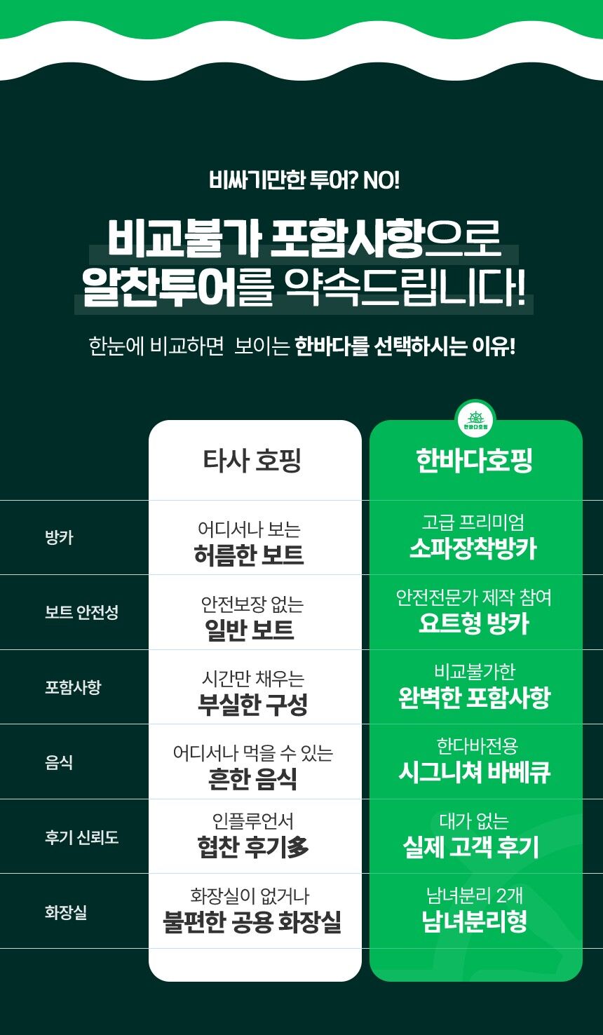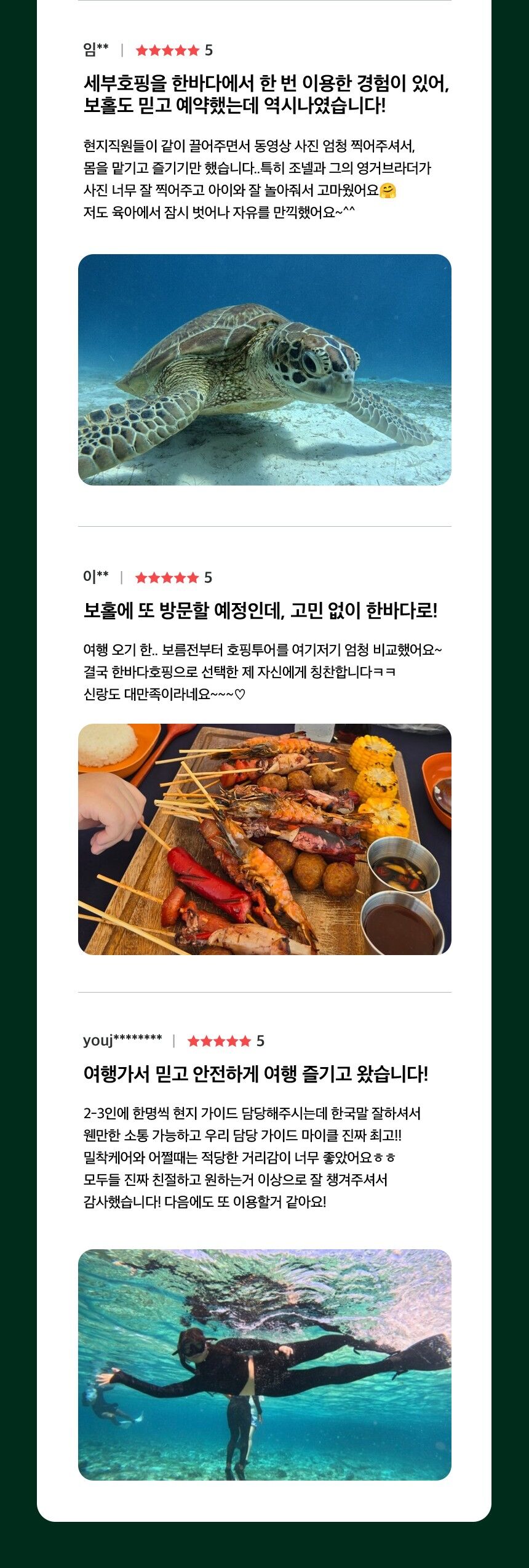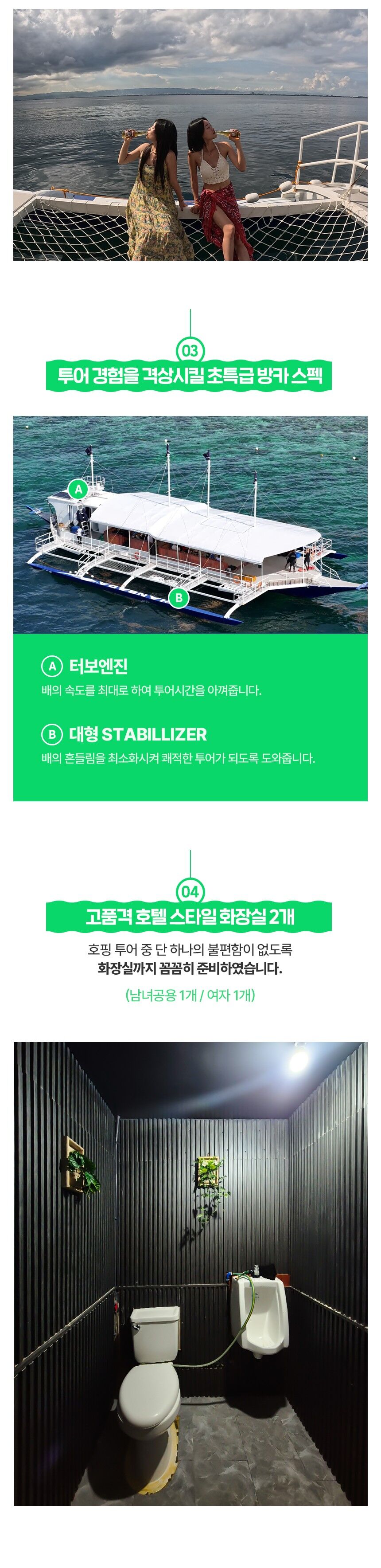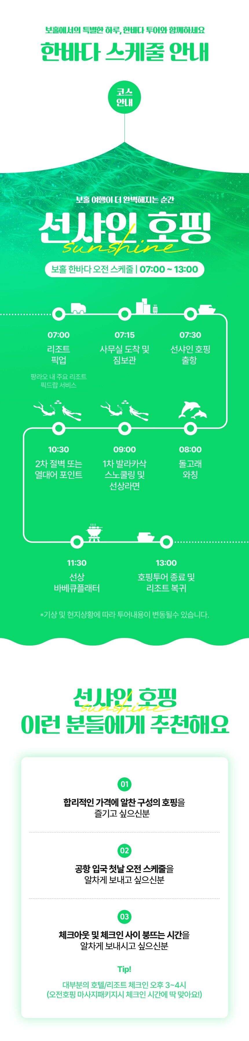 - - 한국인 호핑 스텝 참여 - 호핑현지 스텝 2~3인당 1명 배정 - 선상라면, 선상 간식 음료, 생수, 맥주, 열대과일,선상 BBQ - 선상 촬영 및 수중 촬영 (유투버들한테 핫한 DJI오즈모캠 촬영) - 짐보관 서비스 - 비상약품 - 비치타월, 스노쿨링장비 - 픽드랍( 팡라오 내 주요리조트 무료픽드랍 )