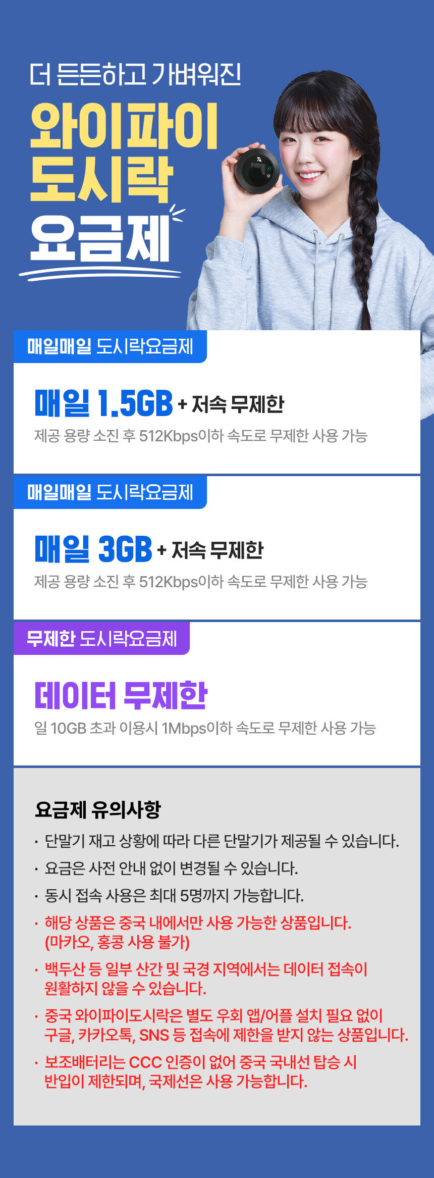 [포켓와이파이] 중국 와이파이도시락 무제한 데이터 + 해외로밍전화 무료 평점 3.9228070175439 · 리뷰 285건 포함 1. 와이파이도시락 단말기 2. 와이파이도시락 파우치 3. 충전기 & 충전 케이블 4. 변환플러그(요청 시) 5. 사용가이드북 6. 도시락톡 해외무료통화 100분 무료 불포함 포함사항 외 부가서비스 마이리얼트립에서 예약하기 시안 목록 도시 목록