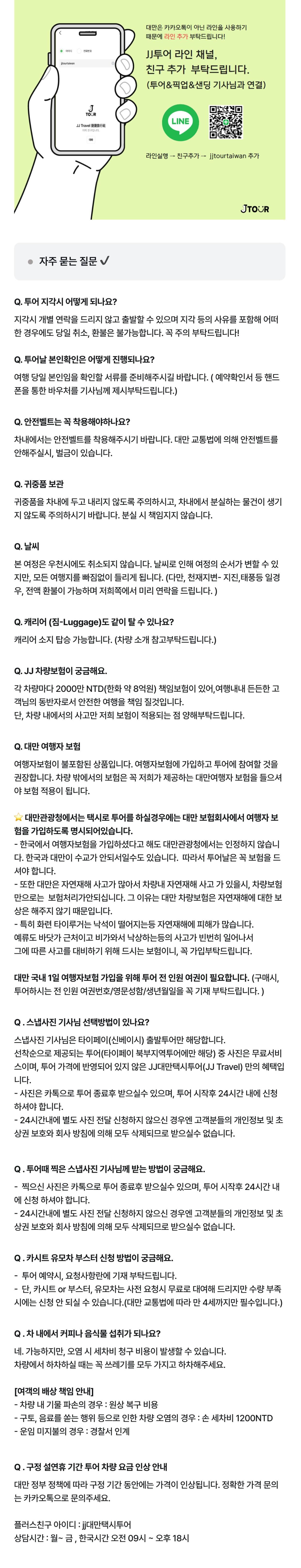 [1~8인] [가오슝출발] 당일치기 타이난 10시간 코스 평점 5 · 리뷰 1건 포함 - 현지 기사님 - 차량 - 유류비,통행료,기사식사비용 - 차량보험 - 차량 내 WIFI 무료 (기사님께 요청하셔야 가능) - 생수 제공 그 외 서비스는 기본 제공 사항이 아닙니다 불포함 - 가이드 서비스 - 개인경비(간식비/식사비 등) - 입장료 등 마이리얼트립에서 예약하기 가오슝 목록 도시 목록