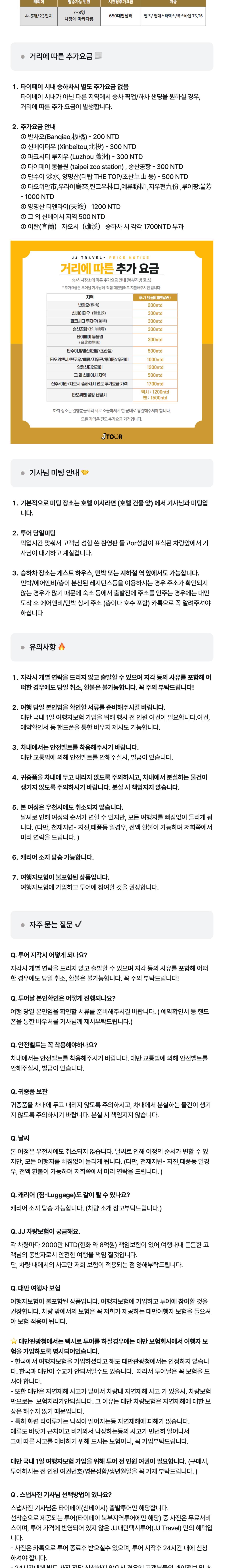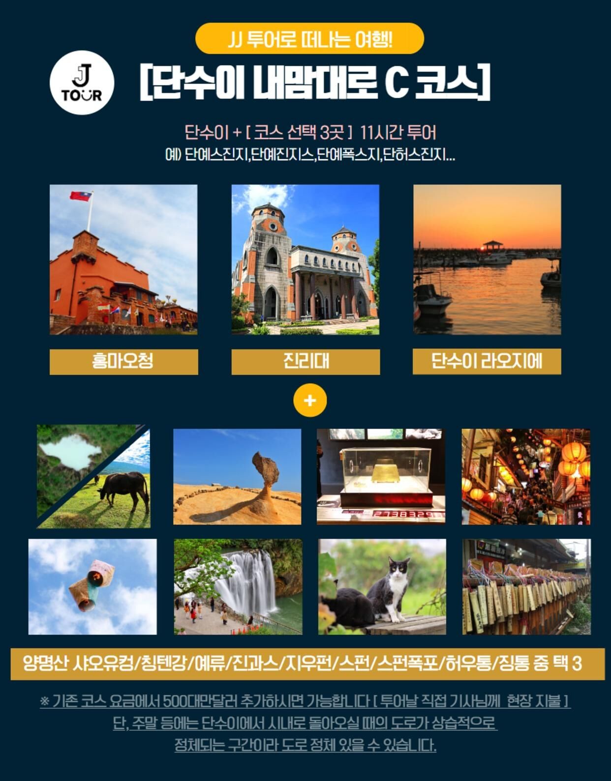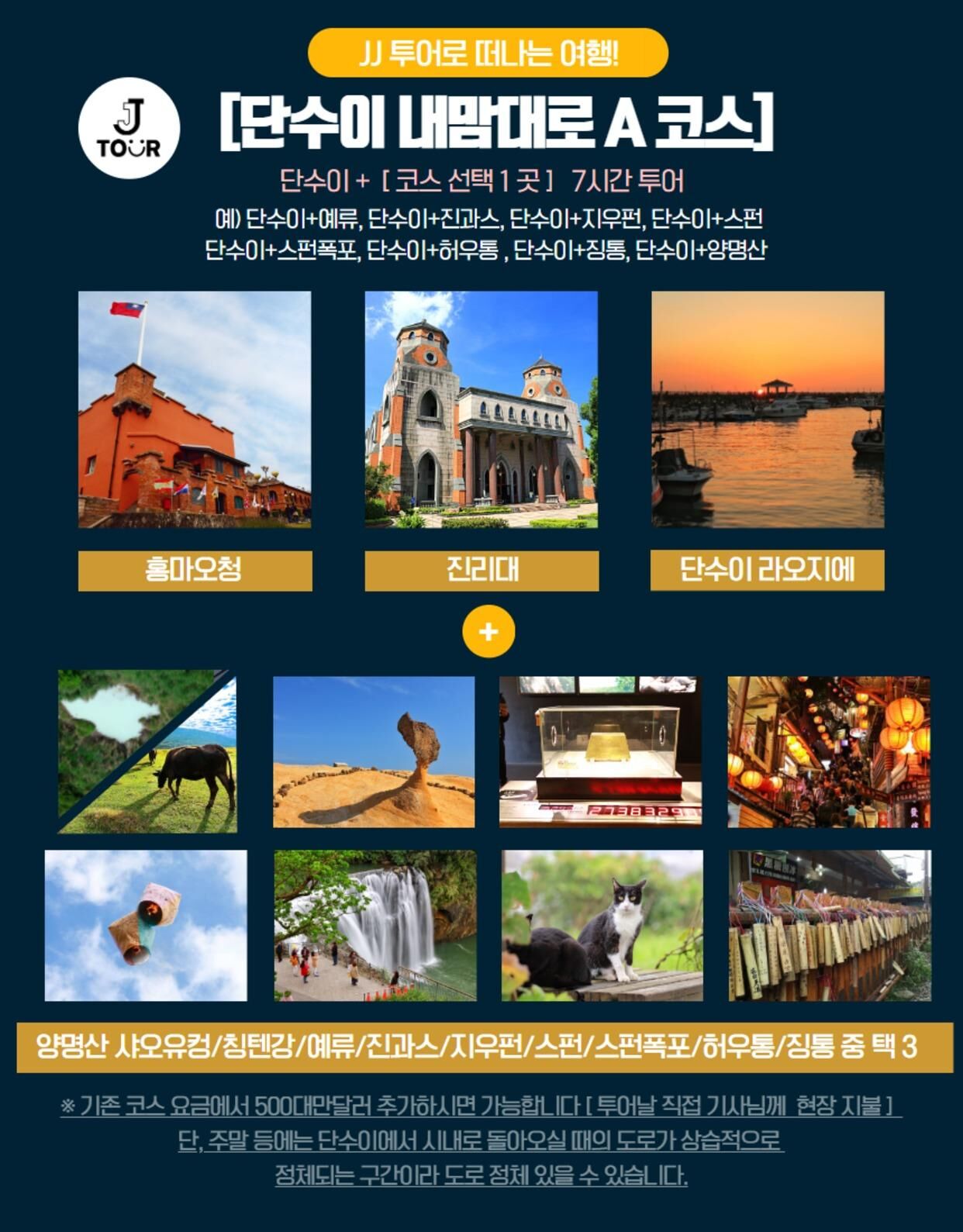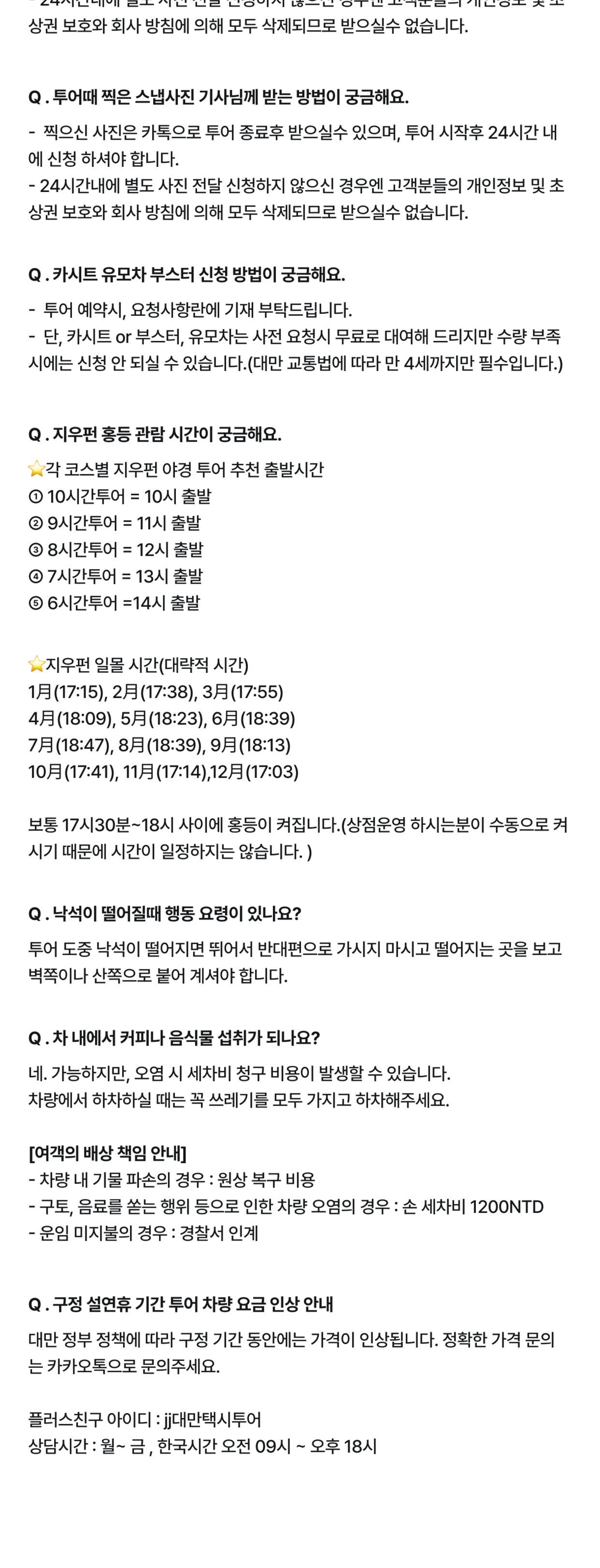 - - 가이드 서비스 - 개인경비(간식비/식사비 등) - 입장료 등 - 단수이 마지막 코스로 방문 시 기존 코스 요금에서 500대만달러 추가 하시면 가능합니다. (투어당일 기사님께 현장지불)