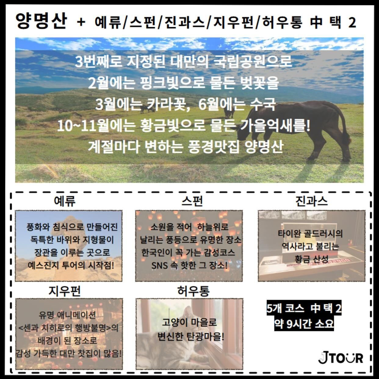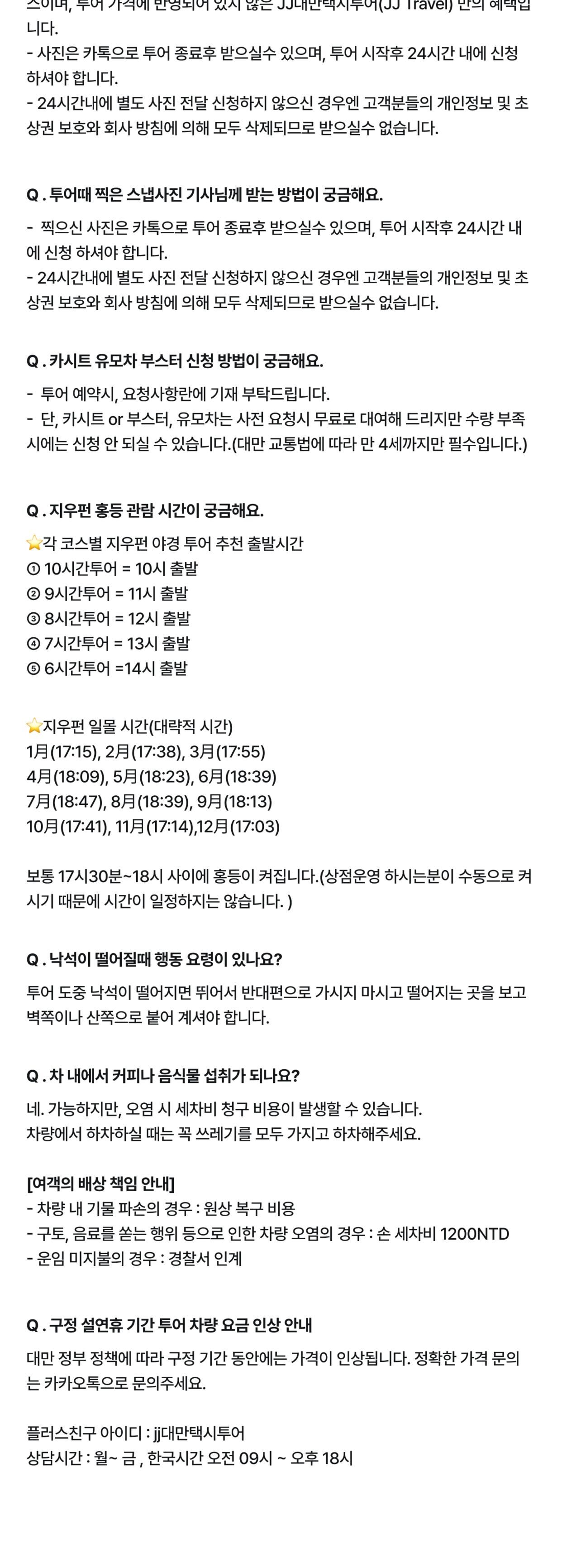 [1~8인] 대만 양명산 + 택 2 (예/스/진/지/폭/허 ) (타이페이 출발) 9시간코스 평점 5 · 리뷰 3건 포함 - 현지 기사님 - 차량 - 유류비,통행료,기사식사비용 - 차량보험 - 차량 내 WIFI 무료 (기사님께 요청하셔야 가능) - 생수 제공 그 외 서비스는 기본 제공 사항이 아닙니다 불포함 - 가이드 서비스 - 개인경비(간식비/식사비 등) - 입장료 등 마이리얼트립에서 예약하기 타이페이 목록 도시 목록