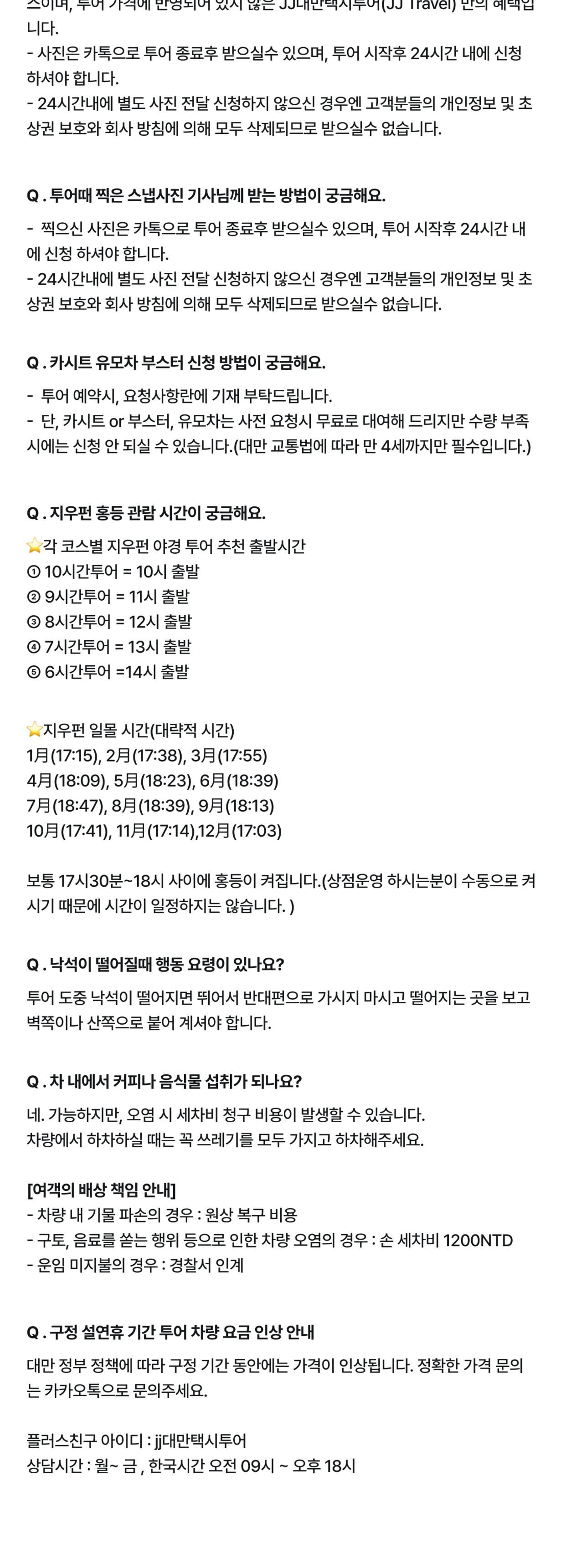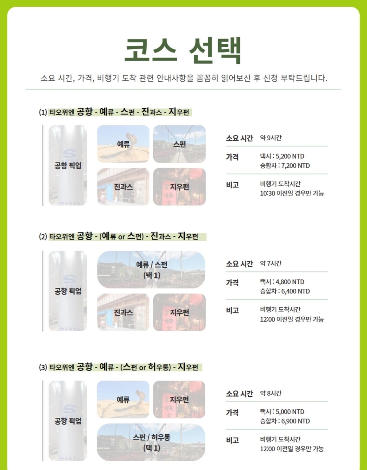 [1~8인] 대만 타오위안 공항 픽업 + 바로 투어 (예/스/진/지/폭/허) 중 택 4 평점 5 · 리뷰 4건 포함 - 현지 기사님 - 차량 - 유류비,통행료,기사식사비용 - 차량보험 - 차량 내 WIFI 무료 (기사님께 요청하셔야 가능) - 생수 제공 그 외 서비스는 기본 제공 사항이 아닙니다 불포함 - 가이드 서비스 - 개인경비(간식비/식사비 등) - 입장료 등 마이리얼트립에서 예약하기 타이페이 목록 도시 목록