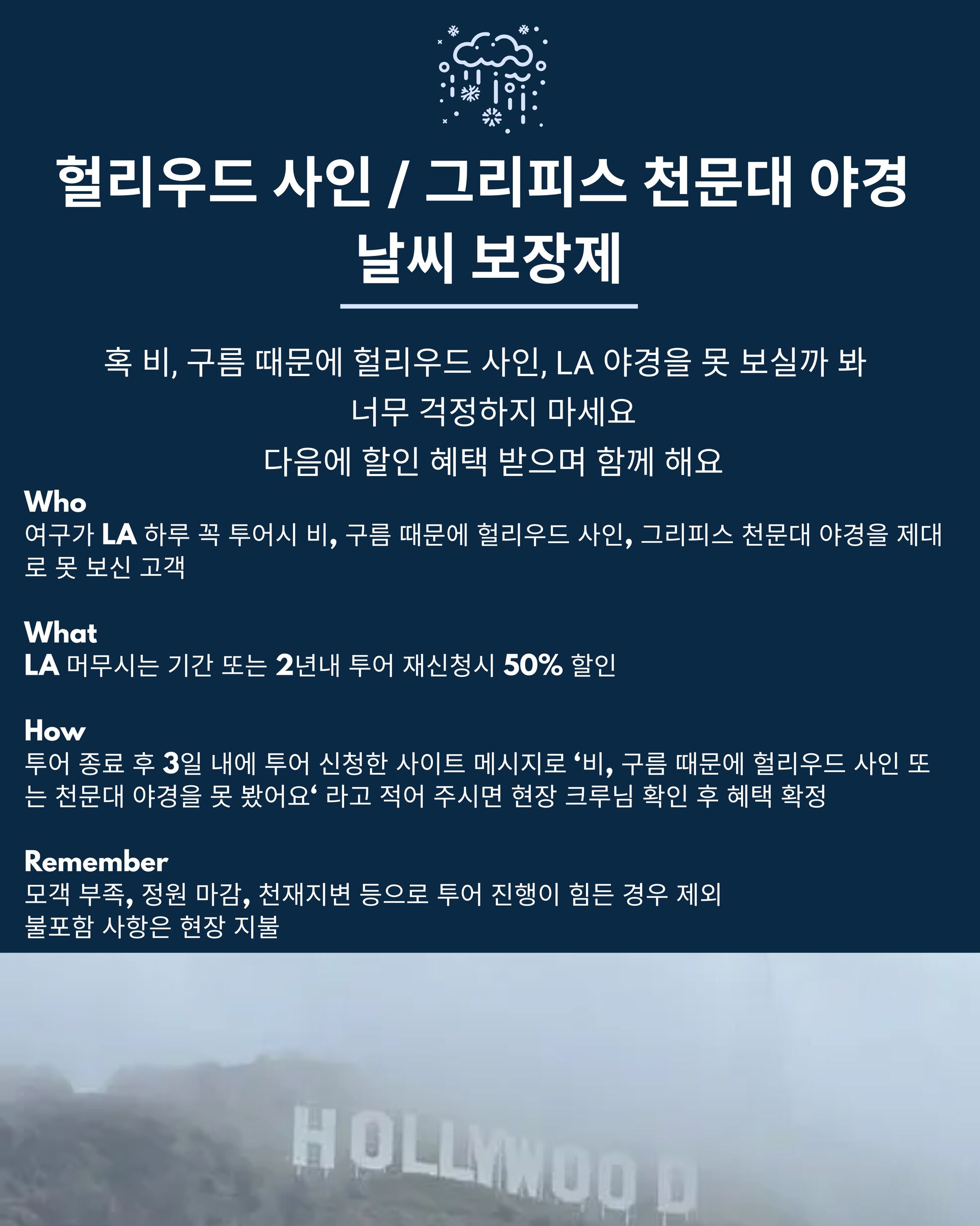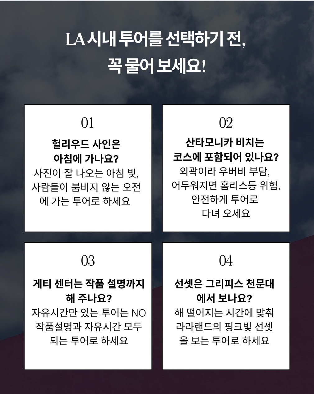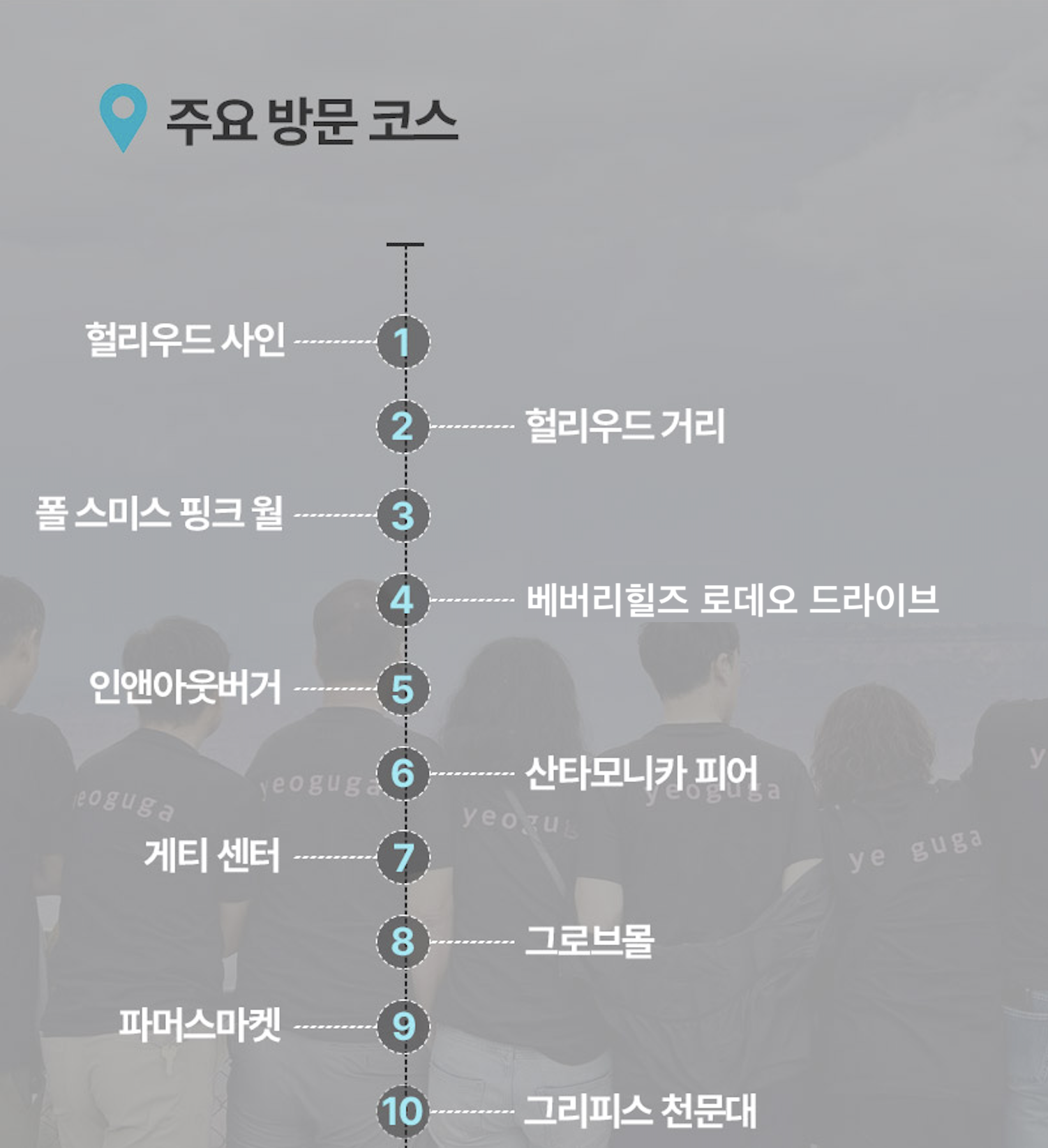 /2026 베스트/ 여구가 LA 하루 꼭 투어, 이 투어 하나로 LA끝내기 평점 4.9601941747573 · 리뷰 1030건 포함 * 게티 센터, 헐리우드, 그리피스 천문대 등 주차 & 투어 차량 서비스 * LA 코리아타운 픽업 & 드랍 진행 불포함 상품 설명을 참고해 주세요. * 크루 팁($20/인) 마이리얼트립에서 예약하기 로스앤젤레스 목록 도시 목록