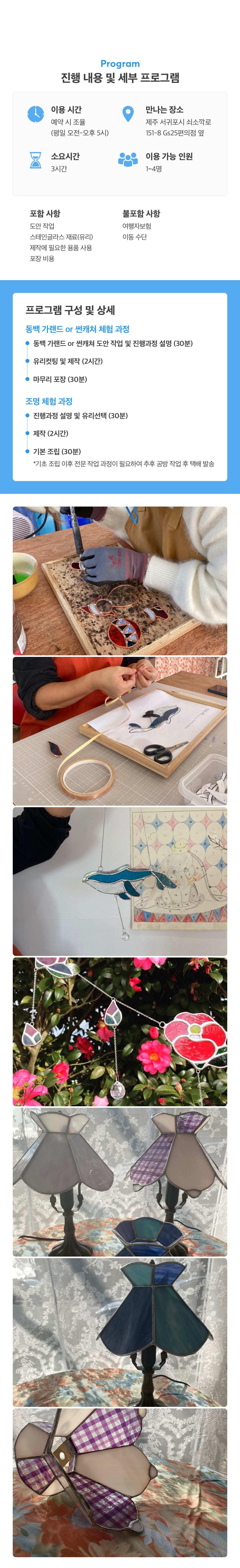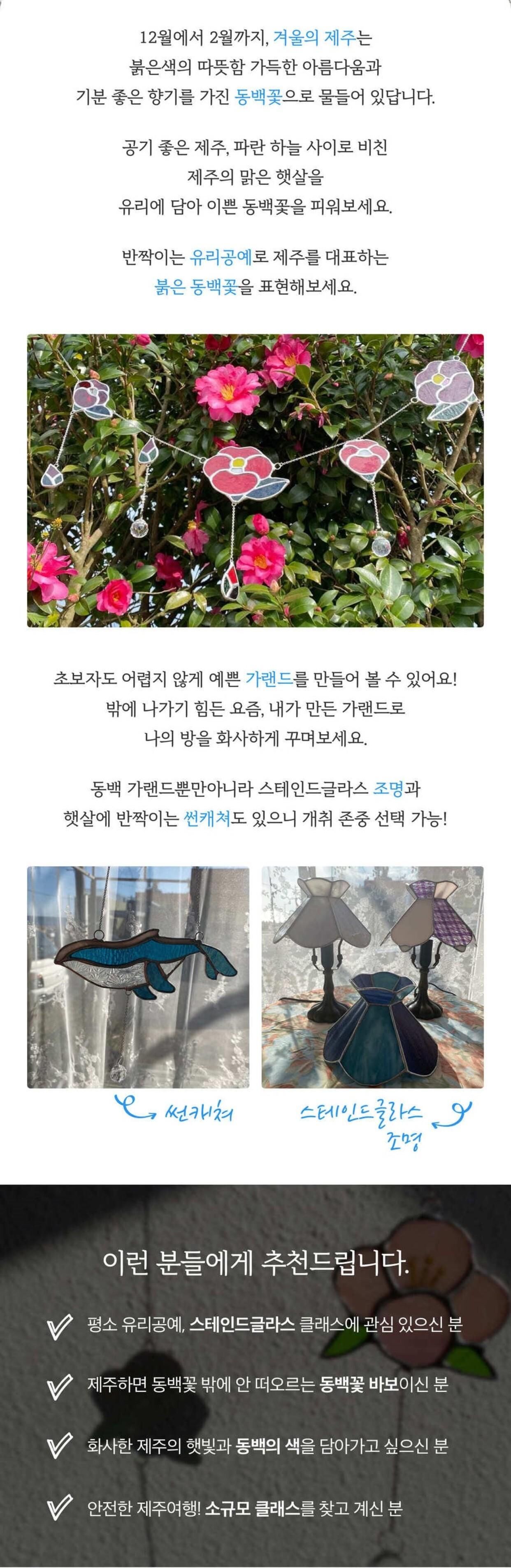 (서귀포_유리공예) 다채로운 색 그리고 치유를 간직한 스테인드글라스 체험 평점 5 · 리뷰 5건 포함 도안 작업 스테인글라스 재료(유리) 제작에 필요한 용품 사용 포장 비용 *조명작품의 경우 배송비도 포함(전국) 불포함 여행자 보험 이동 수단 동백꽃 1개 추가 시 추가 금액 발생(10,000원) 마이리얼트립에서 예약하기 서귀포 목록 도시 목록