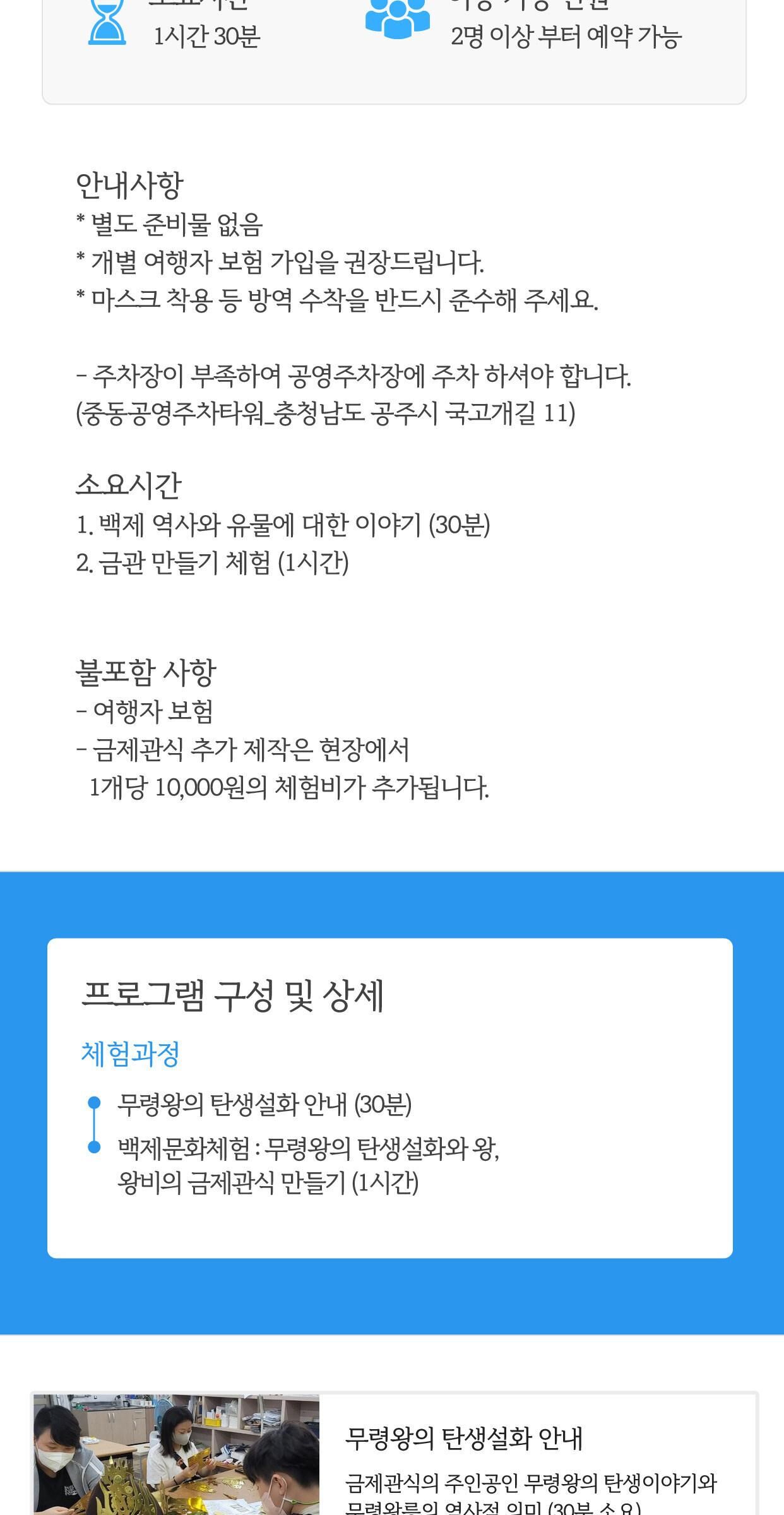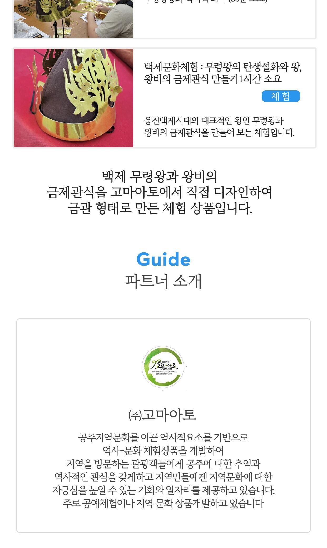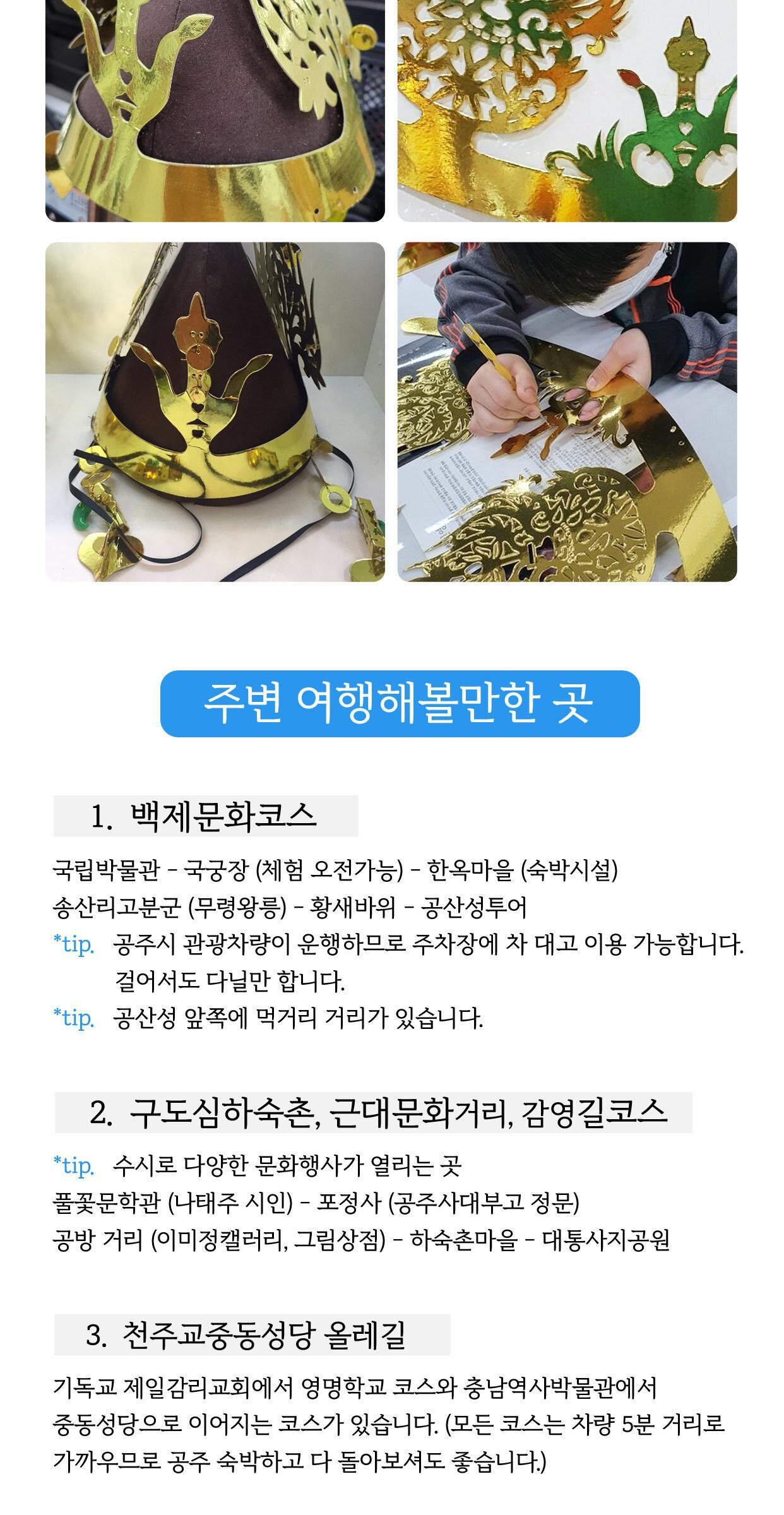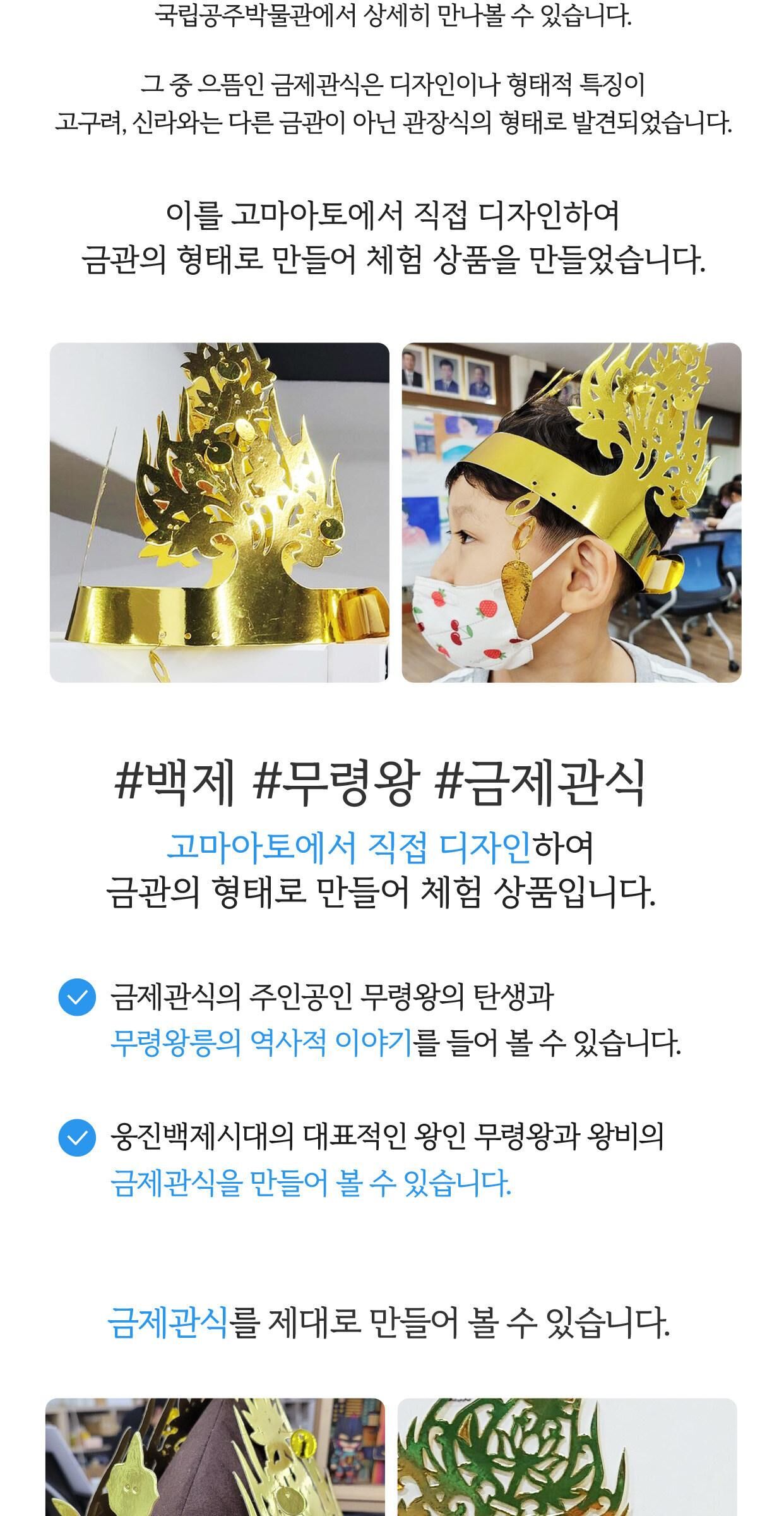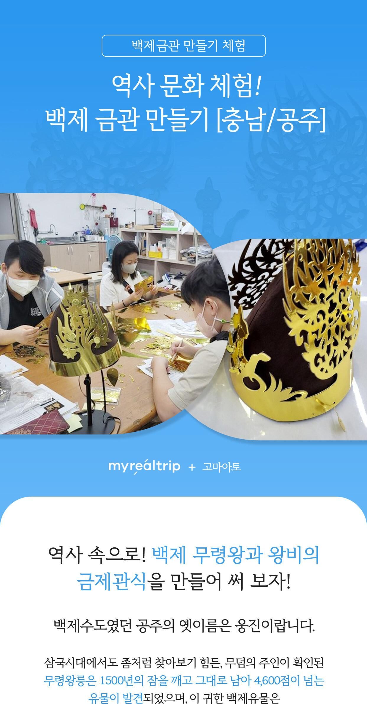 역사 문화 체험! 백제 금관 만들기 [충남/공주] 평점 4.8181818181818 · 리뷰 11건 포함 - 체험비 - 재료비 (금제관식- 왕 또는 왕비-과 부직포 모자 1개) 불포함 - 여행자 보험 - 금제관식 추가 제작은 현장에서 1개당 10,000원의 체험비가 추가됩니다. 마이리얼트립에서 예약하기 공주 목록 도시 목록