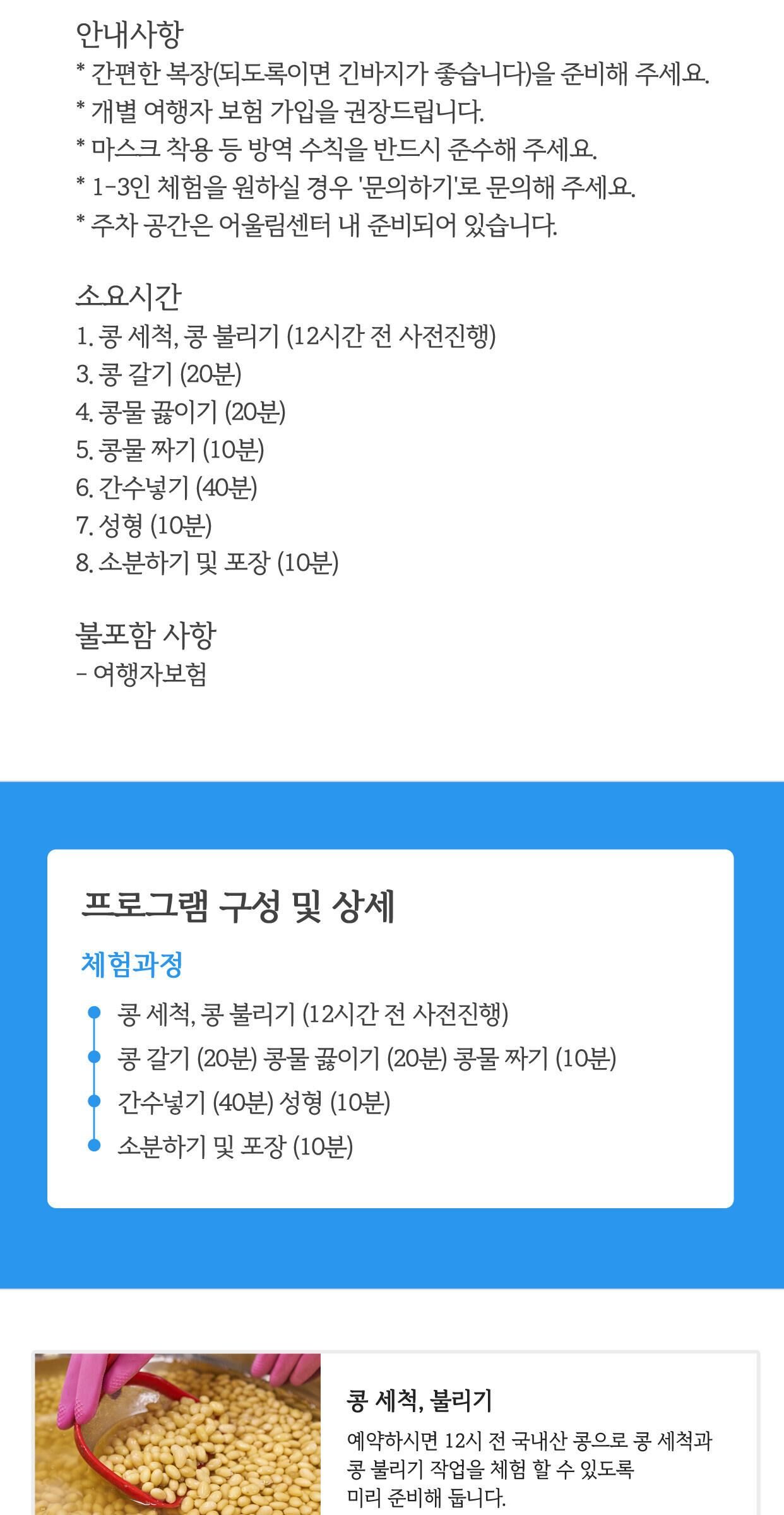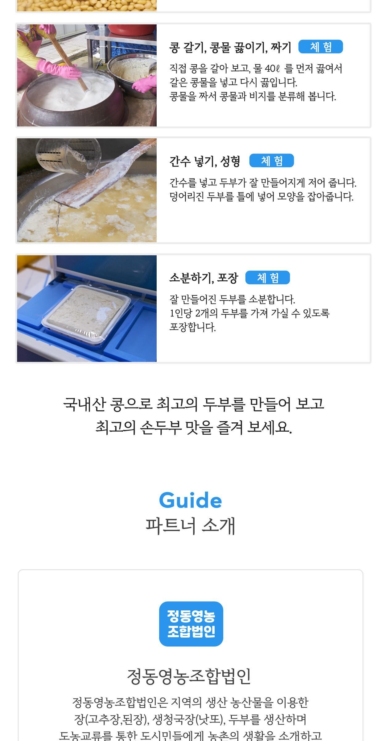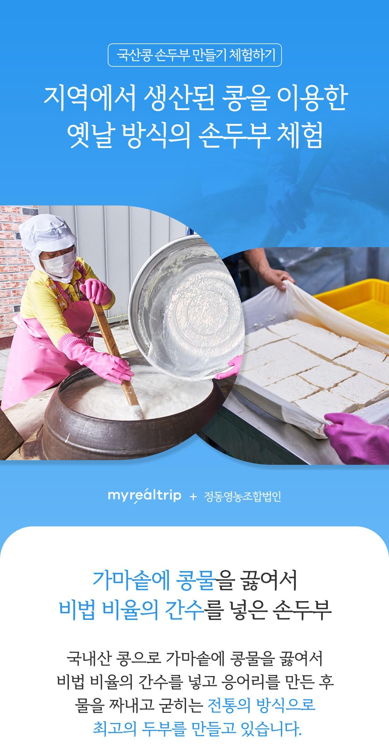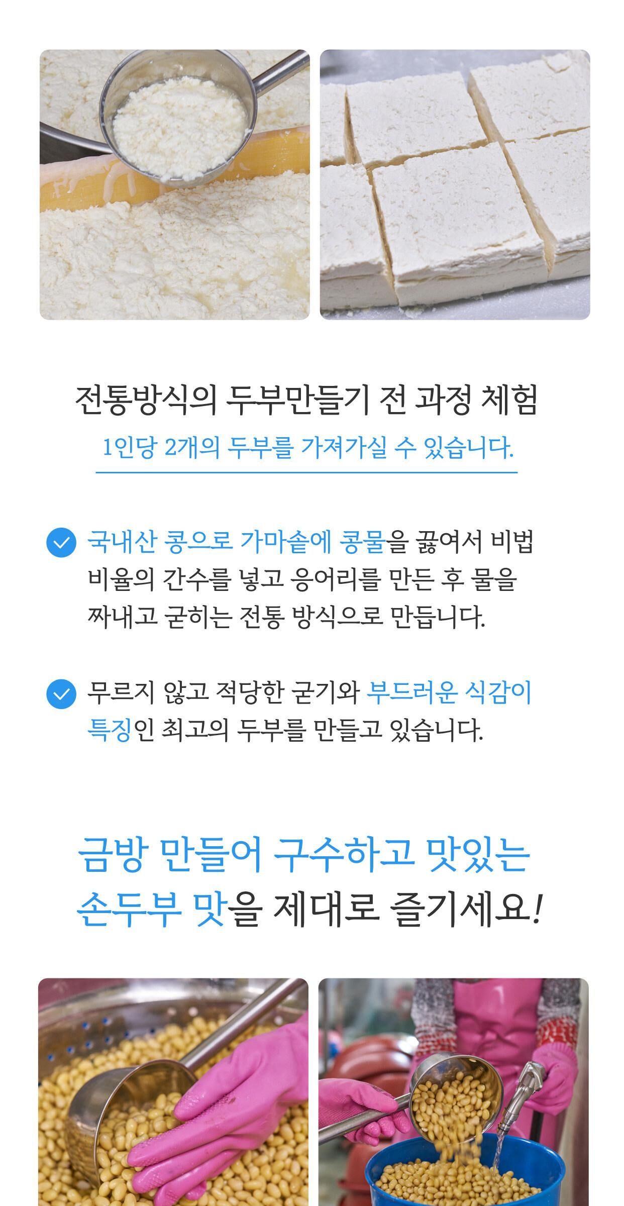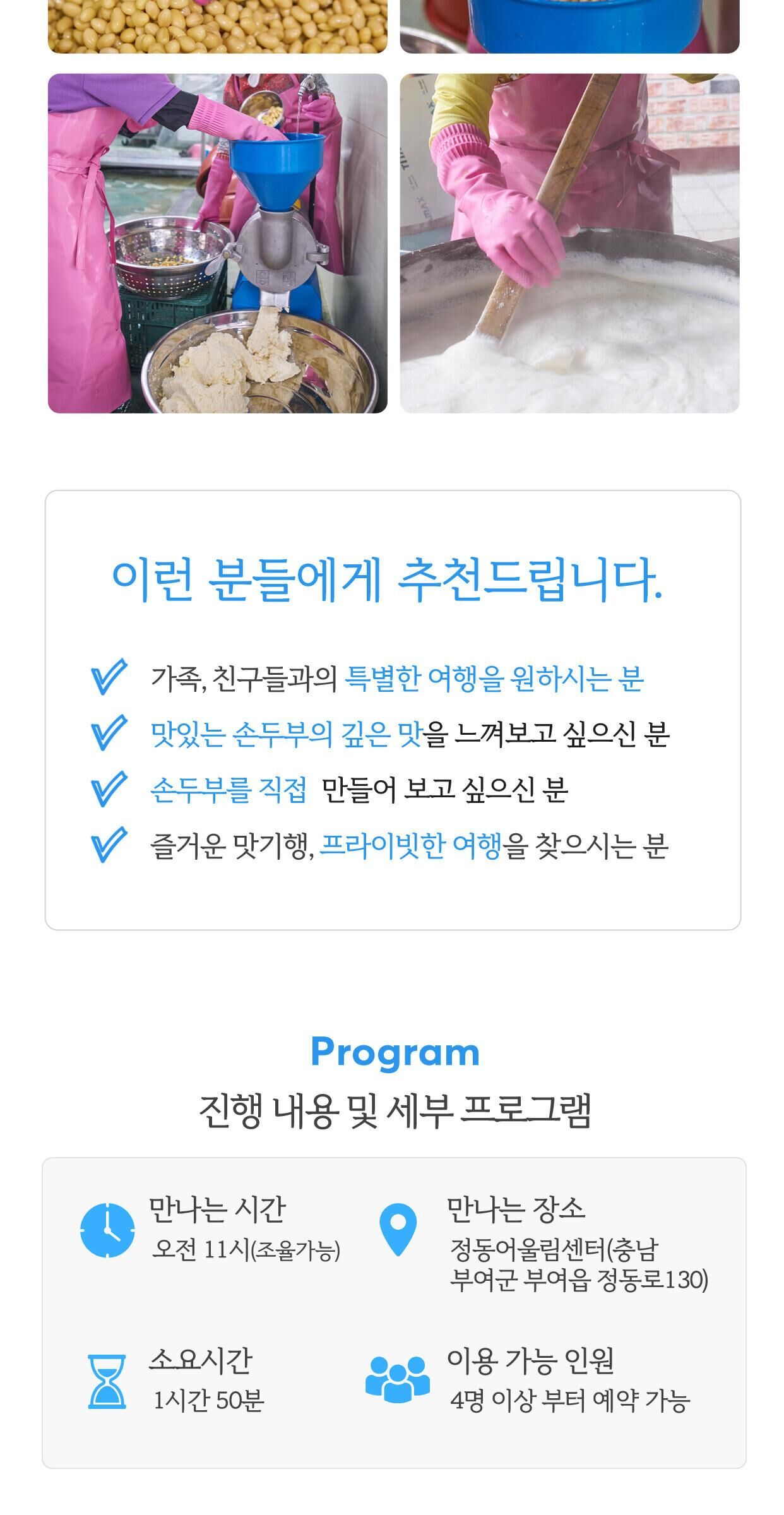 지역에서 생산된 콩을 이용한 옛날 방식의 손두부 체험 [충남/부여] 본문: 로컬 DB 동기화 상세 평점 4.9 · 리뷰 11건 포함 - 체험비 - 1인당 두부 2모 제공 불포함 - 여행자 보험 마이리얼트립에서 예약하기 대전 목록 도시 목록