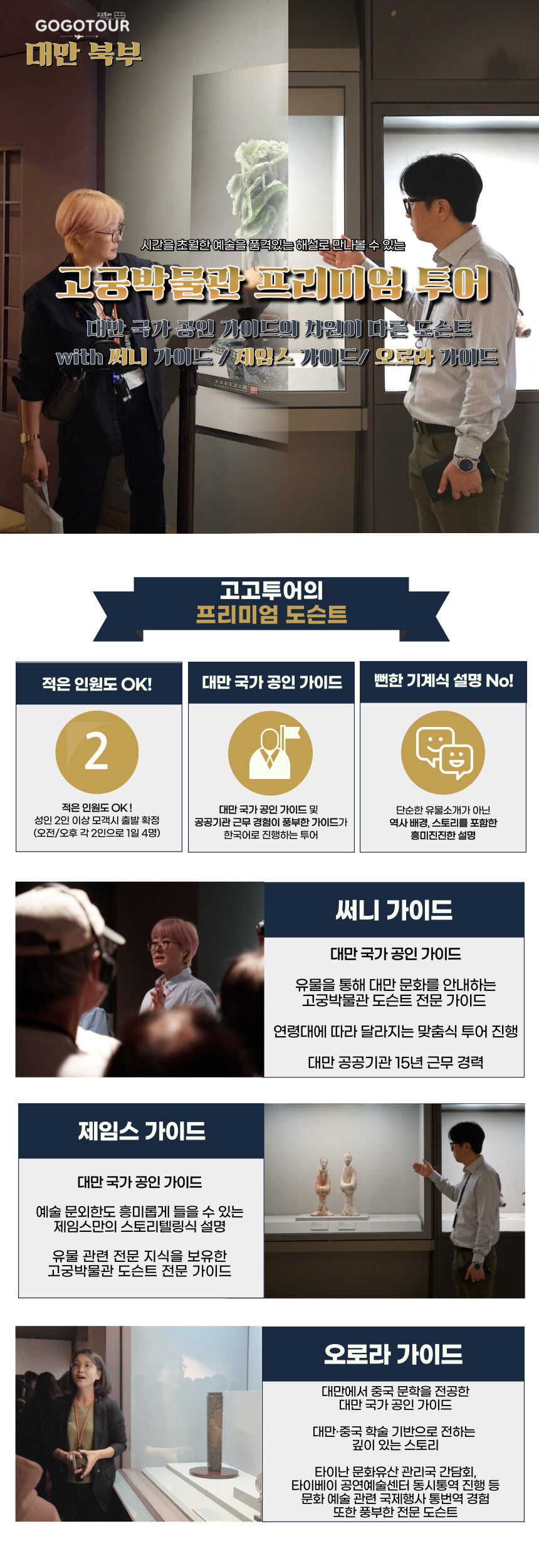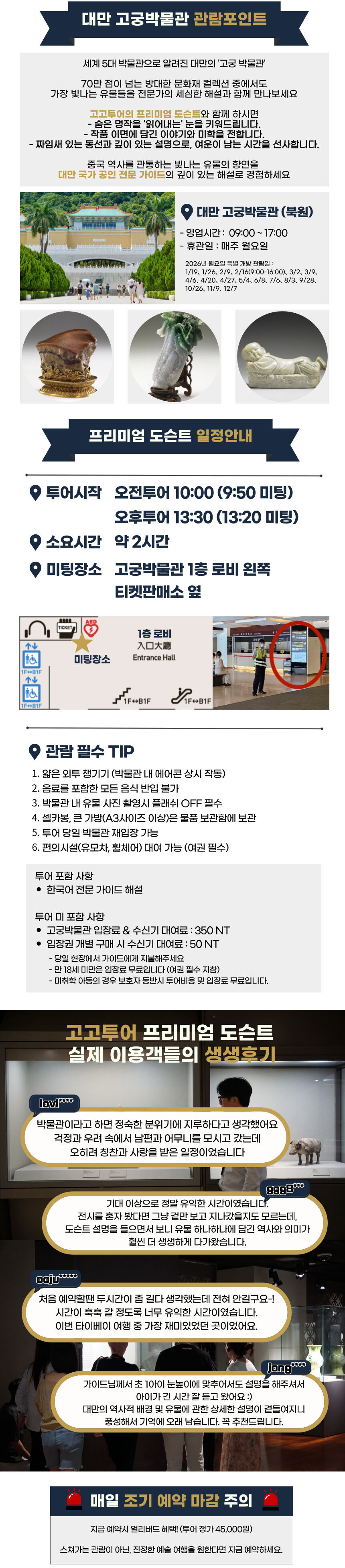 [한국인 도슨트] 대만 국립고궁박물관 한국어 도슨트 투어 (오전/오후 선택가능) 평점 4.951724137931 · 리뷰 580건 포함 • 전문 가이드 해설 불포함 • 고궁박물관 입장료 및 수신기 대여료 : 350 TWD • 입장권 개별 구매 시 수신기 대여료 : 50 TWD *당일 가이드에게 현장 지불해주세요. *만 18세 미만은 입장료 무료입니다. (여권 필수 지참) *미취학 아동의 경우 보호자 동반 시 무료 이용 가능합니다. (투어 비용 & 입장권 무료) *개별 여행자 보험 마이리얼트립에서 예약하기 말레 목록 도시 목록