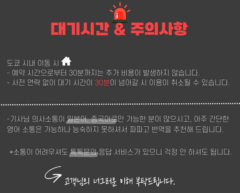 📌 기사님 의사소통이 일본어, 중국어 가능한 분이 많으시고, 아주 간단한 영어 소통은 가능하나 능숙하지 못하셔서 파파고 번역을 추천해 드립니다.